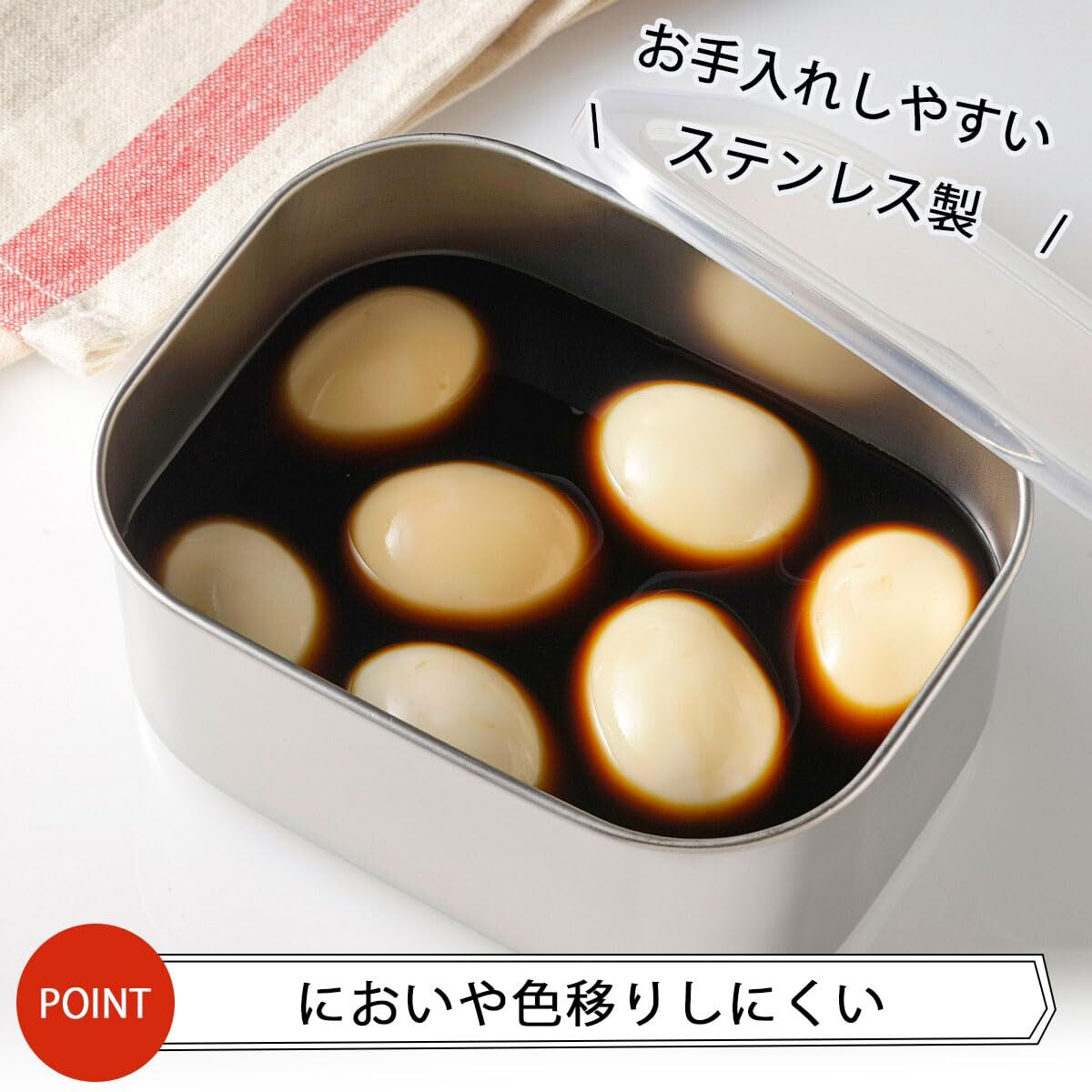 説明 深い形がとっても便利。汁物の保存にも 残り物の一時保存、下ごしらえに 四角いから冷蔵庫や収納場所にもピタッと収まる 臭い移りも少ない18-8ステンレス製 シールフタ付きで一時保存に便利