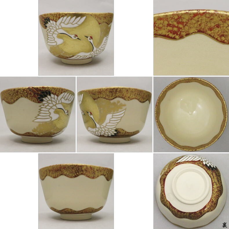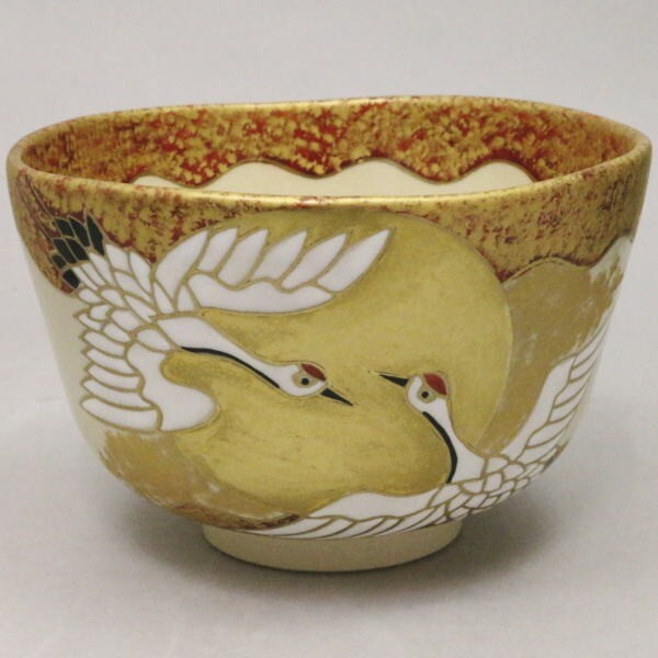 抹茶茶碗 慶祝茶碗 仁清写し 旭光に双鶴茶碗 中村源水作(東福窯)