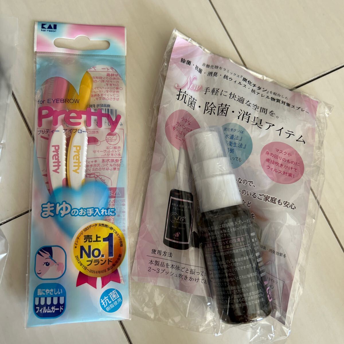 おまけで貝印眉用カミソリプリティを2本、除菌消臭スプレーをおつけします。画像の物です。