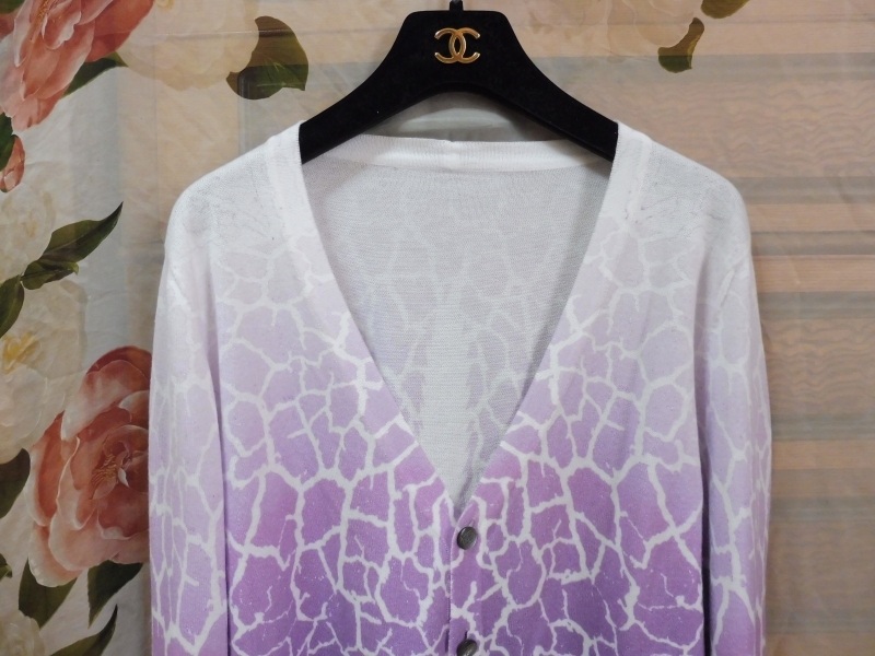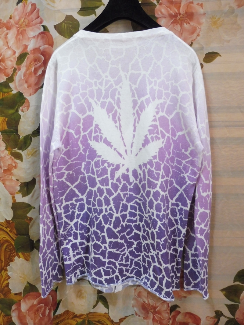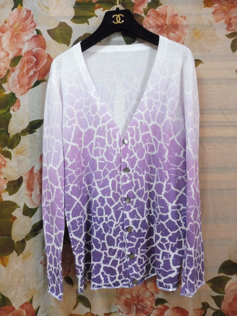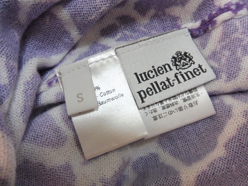 ルシアンペラフィネのカーディガンです。素材表記コットン100%。サイズ表記S。平置き採寸は肩幅39㌢、腕下身幅48㌢、着丈64㌢、袖丈59㌢。男性用での購入ですがサイズ的に小さく、レディースとして出品。白地にパープルカラーのグラデーションのマーブル柄で背に大きなヘンプの染め抜き。前は定番のマザーオブパールのスカル刻みシェルボタンが6個。超高級コットン素材。イタリア製、国内正規品。参考価格22万円超? 使用感ほとんどなしの新同レベルを非常識激安です。
