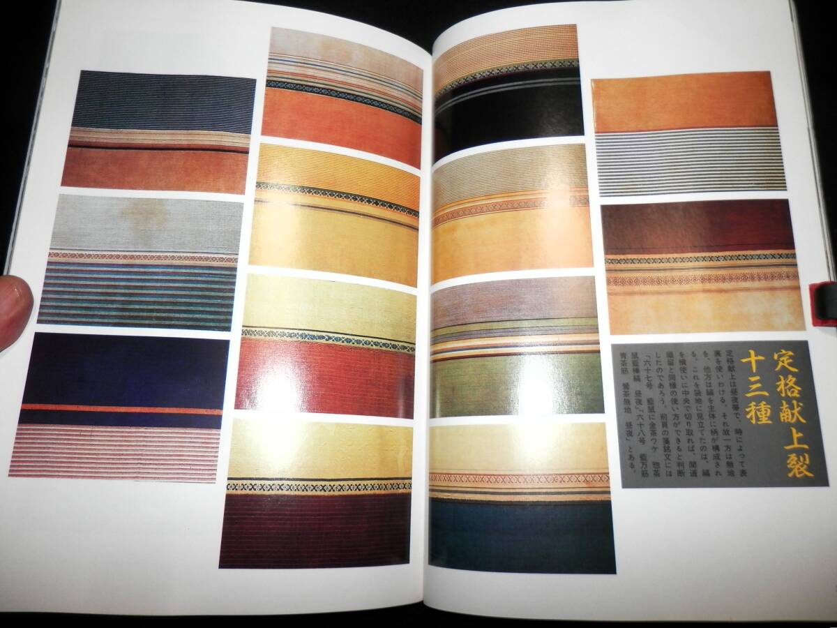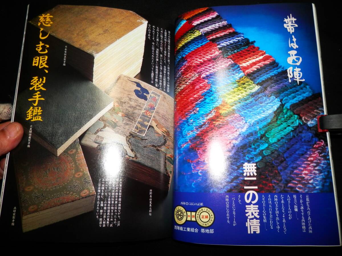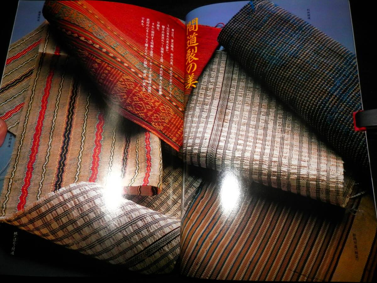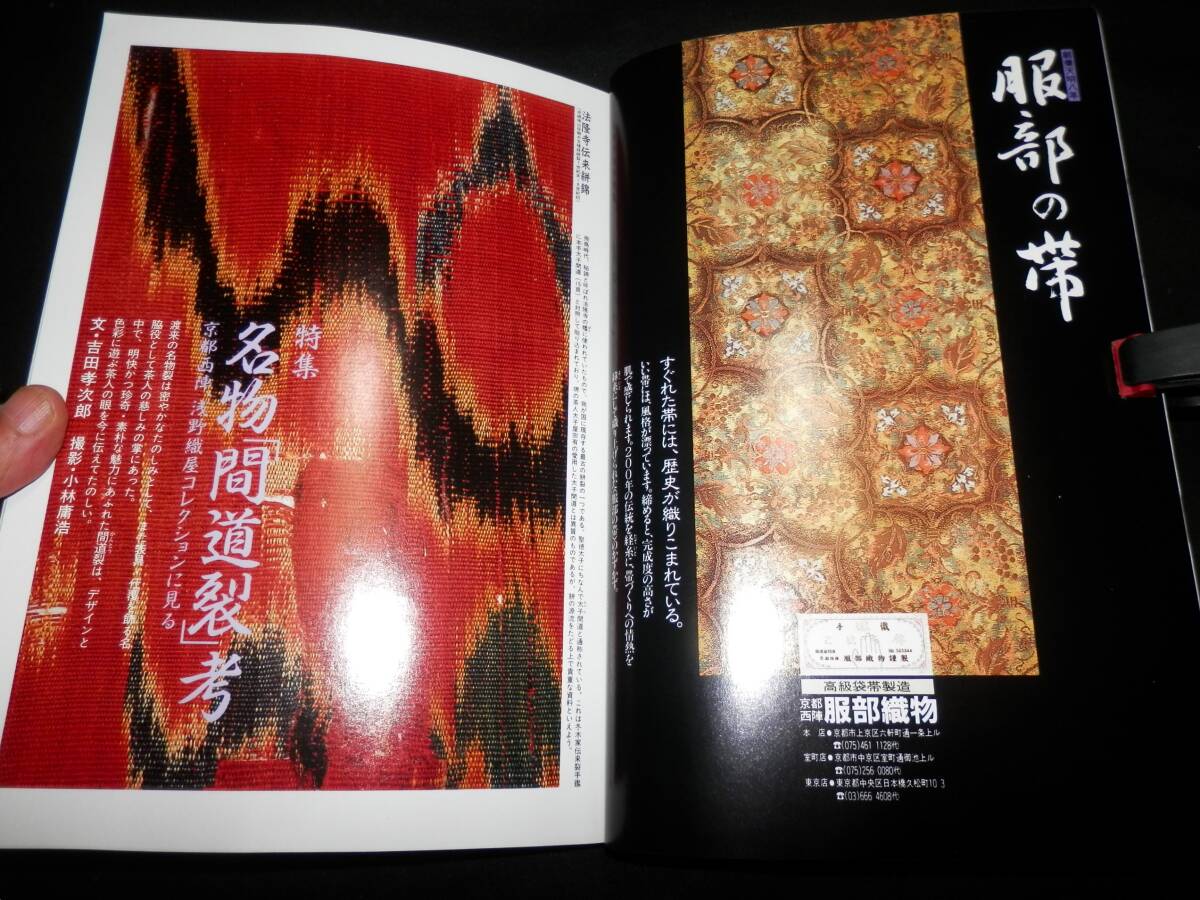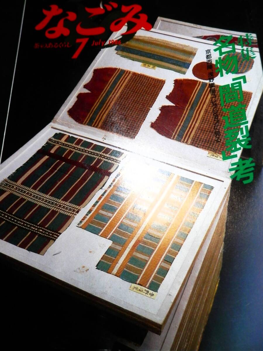 ■■『茶道誌』・・・■■ ●●『なごみ』・・・●● **”1986年7月号・(通巻・79号)”** ■■「特集」・・・■■ ●●『名物・「間道裂」・考』・・・●● ―”京都・西陣・浅野織屋コレクションに見る”― **”文・吉田孝次郎/撮影・小林庸浩”** **”約・43頁”** ★渡来の名物裂は密やかなたのしなみとして・また表具 ・仕覆を飾る・名脇役として、茶人の慈しみの掌にあ った。 中で・明快かつ珍奇・素朴な魅力にあふれた間道裂は ・デザインと色彩に遊ぶ・茶人の眼を今に伝えてたの しい。 ■発行日=昭和61年7月1日。 ■発行所=株式会社、淡交社。 ■サイズ=18.5×25.5cm。 ■定価=600円。 ■状態。 ●表紙に・多少の・キズ・ヤケが有ります。 ●本誌内に・多少の・ヤケが見えますが ●大きなダメージは無く ●年代的には・良い状態に思います。 ◆◆注意・・・◆◆ ★傷みは殆ど有りませんが、本誌全体、横方向 に、歪みが有りますのでご理解下さい。 ★また、発行日より・経年を経て下ります。 コンディションに係らず・古書で有る事を 充分に御理解の上・御入札下さい。 ★神経質な方は入札をご辞退下さい・・!! ●全・128頁・・・!! ●特集の・・・!! ◆「名物・間道裂・考」・は、約・43頁。 ●蒐集、資料などの参考に・・・!! ●探されていた方は・この機会に・・・!! ●以下・詳細をご覧ください・・・!! ◆詳細は・抜粋して下ります。 ◆掲載内容は・Q&Aより・問い合わせ下さい。 ◆数字記載は目視です・間違いは御容赦下さい。 ●掲載を抜粋紹介し・「タイトル」・と致します。 ●●●●●●●●●●●●●●●●●●●●●●●●●●● ◆◆◆◆◆◆◆◆◆◆◆◆◆◆◆◆◆◆◆◆◆◆◆◆◆◆◆ ■■『名物・間道裂・考』・・・■■ ―”京都・西陣・浅野織屋コレクションに見る”― **”文・吉田孝次郎”** **”撮影・小林庸浩”** ◆法隆寺伝来絣綿。 ●●『間道裂の美』・・・●● ★春は花、夏は陽光、秋の冷風、冬の雪と折々にうつろ う山川草木の恵み豊か。 椰子の実流れつく瑞穂なる国、その民が育んだ美意識 は幽玄。 それに相対する明快な造形、これこそが、茶祖達や戦 国武将の心をとらえて離さなかった縞物、『間道』・ の美しさである。 ◆利休間道。 ◆船越間道・(解袋)。 ◆日野間道。 ◆薩摩間道。 ◆しじら・(江岑)・間道。 ●『青木間道』・・・● ★この間道を包む畳紙には・『金沢候御蔵○之内』・と あり、中の極紙に、袋師湖流が極印をおしている。 全く同じ図柄の裂が、前田家伝来として、京都国立物 館に蔵されているが、こちらは、弥兵衛い間道として いる。 青木間道に、しばし弥兵衛間道を冠することがあり、 名称は曖昧ともいう。 横縞を縦に使っている。 ●『紹鴎間道』・・・● ★大名物・『紹鴎茄子茶入』・の・仕覆裂として名高い もので、この解袋の裏面には、墨と胡粉の二つの異な る、あたりと縫目、残糸がみられ、最初は現状と天地 を逆にして、仕覆としていた。 二度目は、写真のように使われ、のち再び解かれ、三 度目は、仕覆となるのを待って両身・座ともで三十両 の値が付けられた。 この、紹鴎間道は、裂自体の美しさに加えて・茶祖へ の敬意を時新たにして、伝えられたといえよう。 仔細に見れば、藍・白茶の千鳥格子は経緯とともに撚 太細の綿、腰の縞において、下の部分は経が強撚太細 の綿による交織となっており、この入念極まる仕掛け が裂全体に微妙な表情を見せている。 ここでは竪縞を横に使っている。 いわゆる阿蘭陀木綿縞でインド産ではなかろうか。 ●『木綿間道』・・・● ★『木綿間道・雨宿挽家之袋えと用ルナリ』・と書かれ た、畳紙に包まれた、木綿間道の裁ち残り。 この書付けに導かれ、同銘の茶入を、静堂文庫に訪ね た。 結果は、縞の構成に類似点はあるものの一致を見かっ た。 ◆雨宿茶入。 ・中興名物。 ・古瀬戸芋庫茶入・銘・『雨宿』。 ・仕覆・青木間道。 ・挽家・竹溜塗・菊蒔絵。 ・挽家袋・阿蘭縞木綿。 ・静嘉堂文庫。 ●『弥三衛門間道』・・・● ★袋師湖流が・『弥三衛門カントウ』・と極めをつけて いるが、本手の弥三衛門間道とは明らかに異なる裂で 、書き誤ったものであろうか。 『裂料三円七十銭』・とあることで、極めの時がほぼ 知れる。 この、解袋に新しく紫平絹の裏地を添えて利用を待っ ている。 ●『相良間道』・・・● ★二つの裂は、縞柄の構成が少し違うものの赤地に黄の 浮織による龍や鳥の表現は、全く同じで、同柄異種の 錦裂でインドネシア産。 と仕覆の裏地は白平絹を芯に・焦茶平絹・緒のつなが りには、縹を取り合わせている。 ●『山の井裂』・・・● ★大名物・古瀬戸・『山の井肩衝』・に使われていた、 木綿間道で、ともに福岡藩黒田家に伝来されたもの。 ★略・・・・・。 ★特に写真上の畳織には、元禄三年袋師袋古の鑑識が、 墨書されている解袋で、長年の使い込みのために、や れてはいるものの、その出自の古さを語り伝えてくれ るものであ