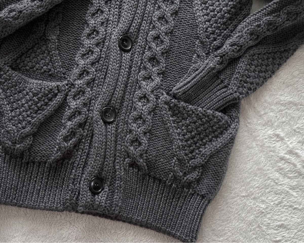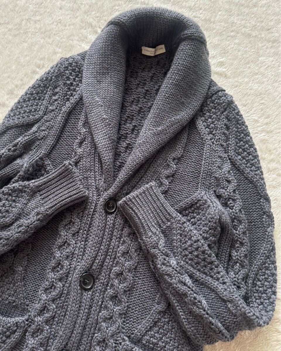 ・上質なニットや天然素材らしいグラデーションカラーの大きめボタンを使用し計算されたモダンなシルエットやアラン編みなど素材、デザインの細部まで丁寧に作り込まれたとてもお洒落なカーディガンになります。