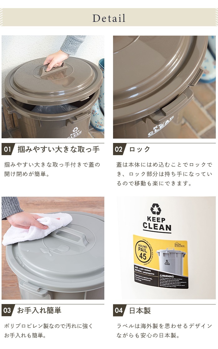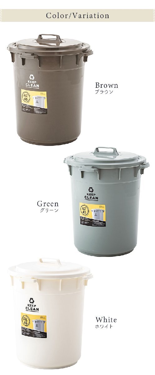 | ※【同シリーズ】のリンクは当店のヤフオク店のページへ進みます。 ● スタッキングペール [スリム]30L / 45L [ワイド]30L / 45L ● スライドペール:30L / 45L ● スライドペダルペール:45L ● ラウンドペール:45L ● バラフライペダルペール:32L ※このページは[ラウンドペール 45L]を販売しております。 |