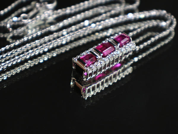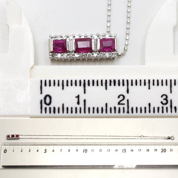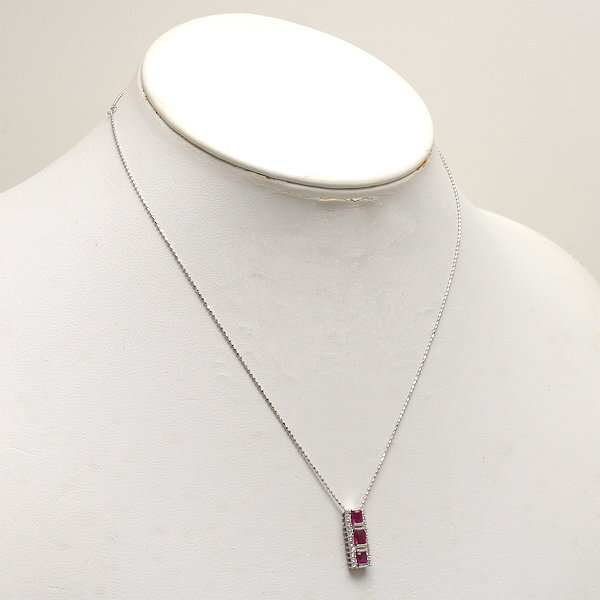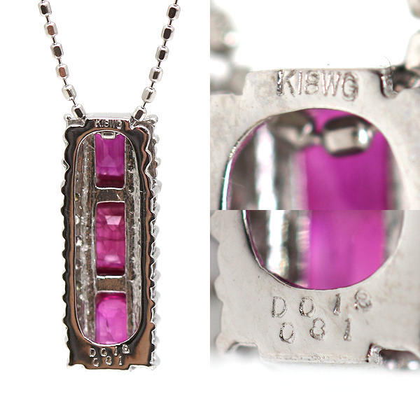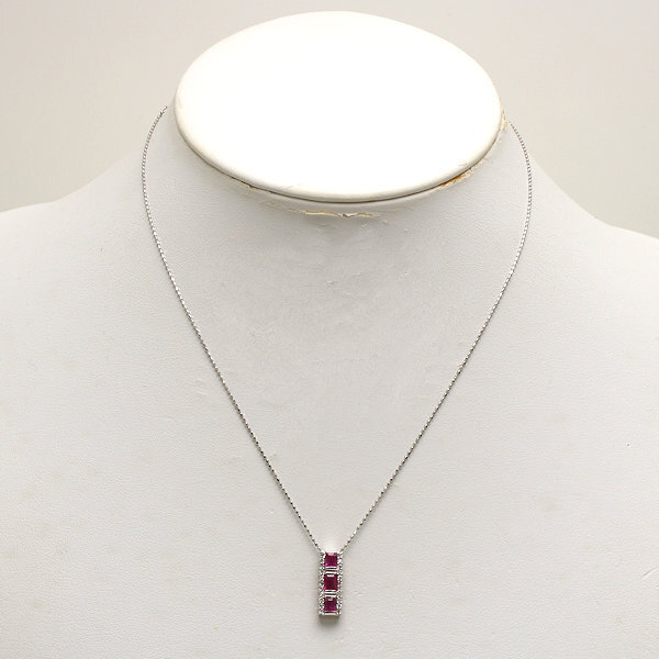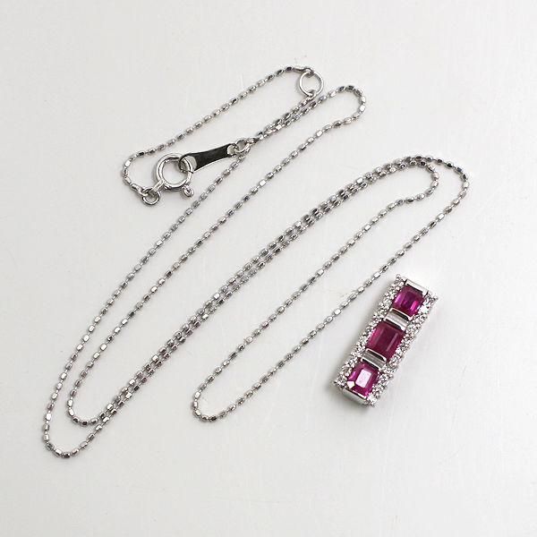 コメント | 情熱的な赤色の輝きを放つルビーが縦ラインにあしらわれたネックレス★ 首元を華やかかつ上品に飾ってくれます♪ K18WGという素材を使っておりますので、地金積立・ゴールド資産としてもオススメ! こちらは未使用に近い、キレイな状態です(中古品により若干の小キズはございます)。 この機会に是非いかがでしょうか? |