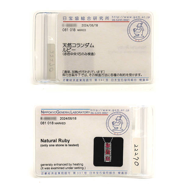 ソーティング記載 | 天然コランダム ルビー (赤色中央1石のみ検査) 通常、加熱が行われています |