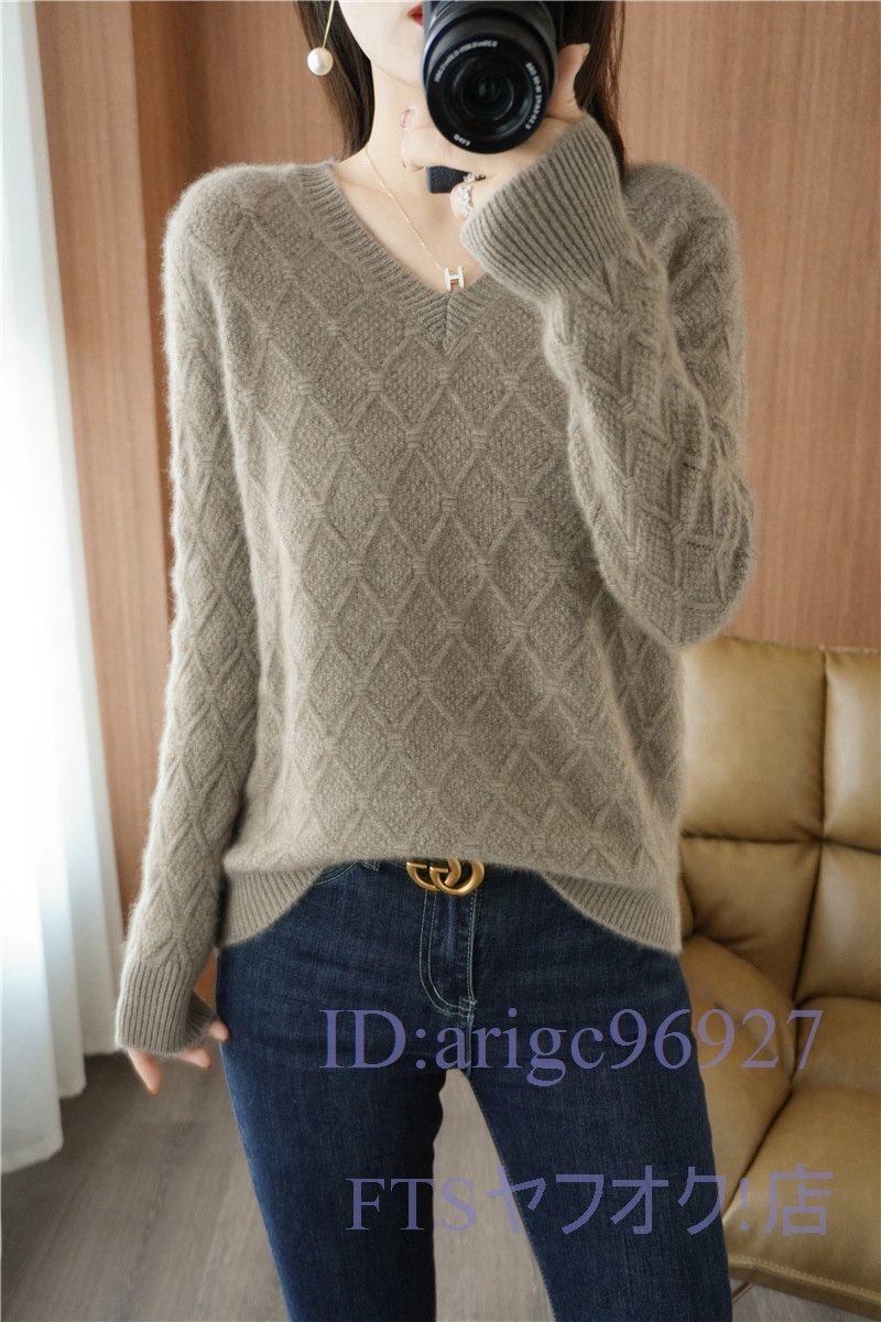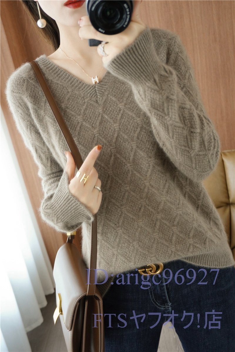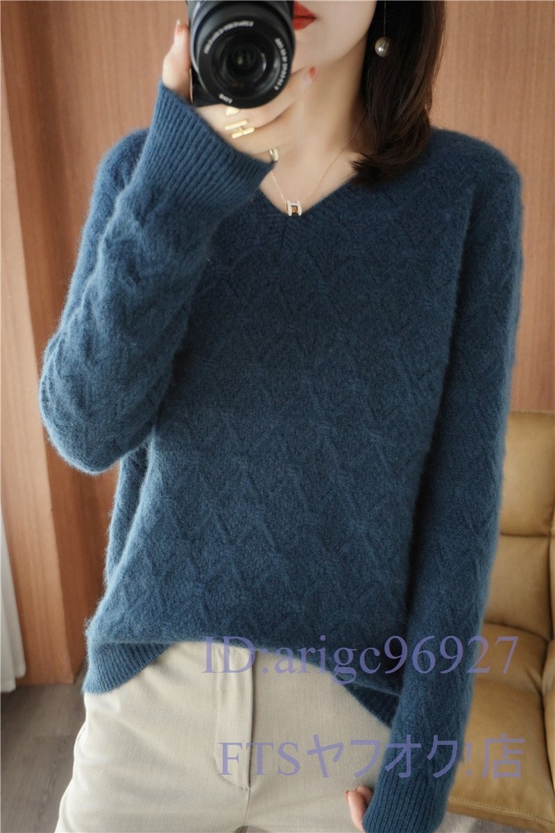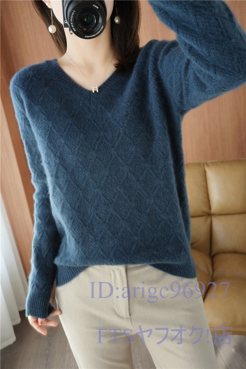 A0585☆新品フリーサイズ Vネック ミンクカシミヤ混 柔らかい 暖かい 20304050代 レディーストップス ニットセーター *ブルー