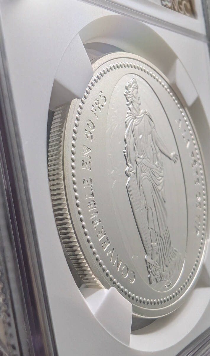 裏面には、花輪の付け根に交差したライフルとその間に吊るされた火薬の角と弾帯が緻密に描かれており、中央には「50 FR」という額面が刻まれています。このコインはプルーフ(PF)品質で、流通する通常のミントステート(MS)コインとは異なり、特に贈答用やコレクター向けに精緻に作られています。25年前の銀貨とは思えないほどピカピカで美しい銀貨です。