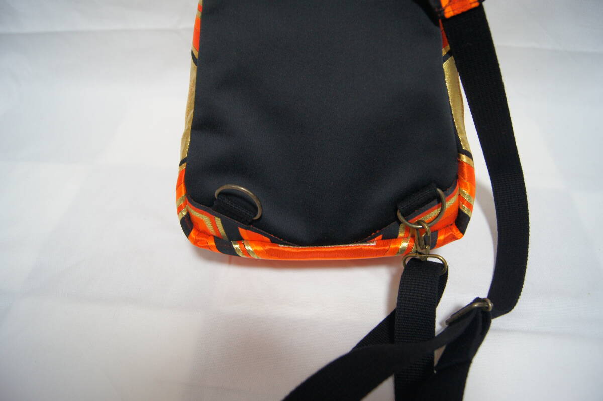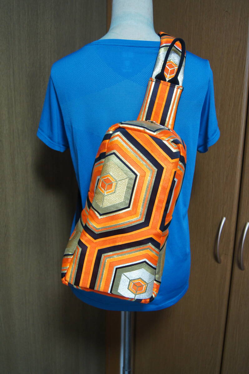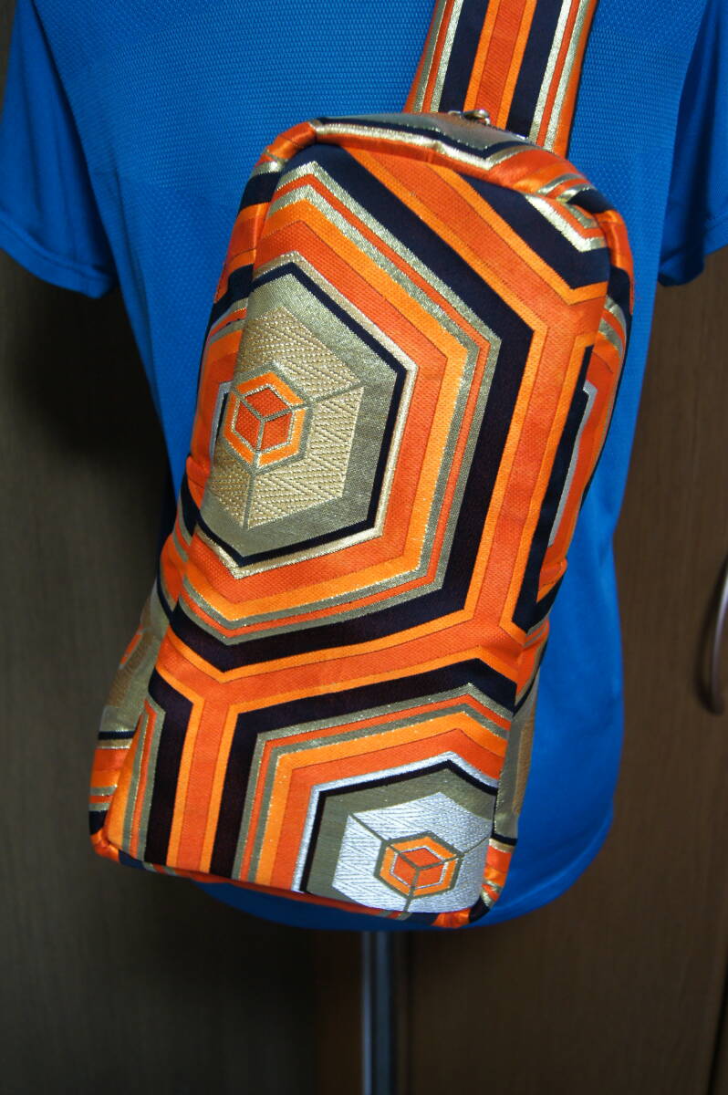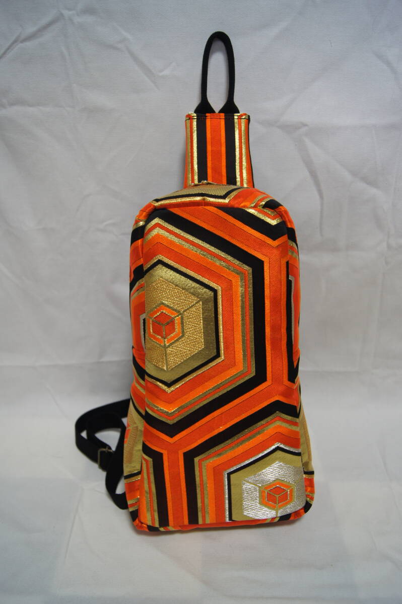 ボディーバッグ 帯地リメイク ハンドメイド 亀甲模様 オレンジ/ブラック/ゴールド系 男女兼用 (#B30) |