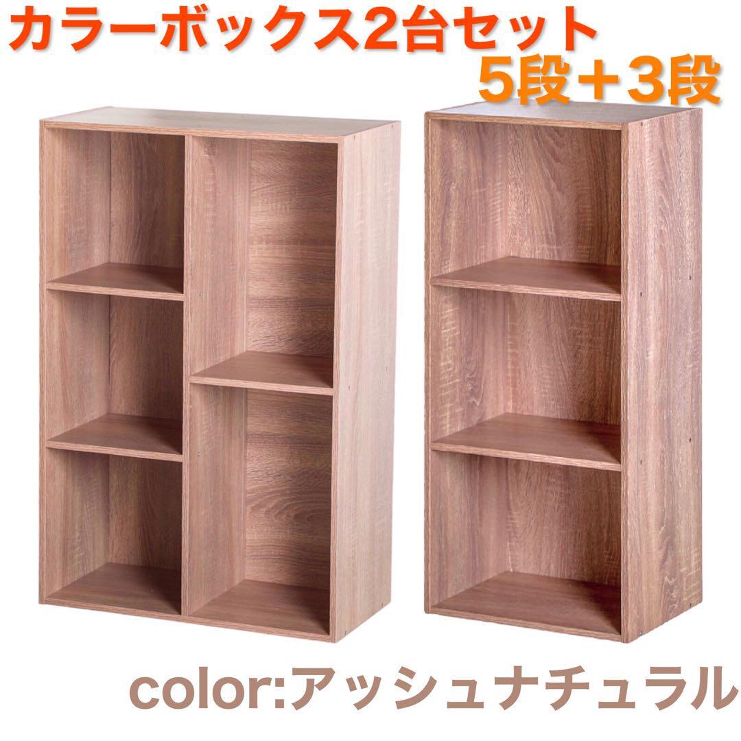 カラーボックス2列5段+カラーボックス3段 (アッシュナチュラル)2台セット 本棚 絵本棚 収納棚 CD DVD 教科書 子供部屋 A4 おもちゃ棚