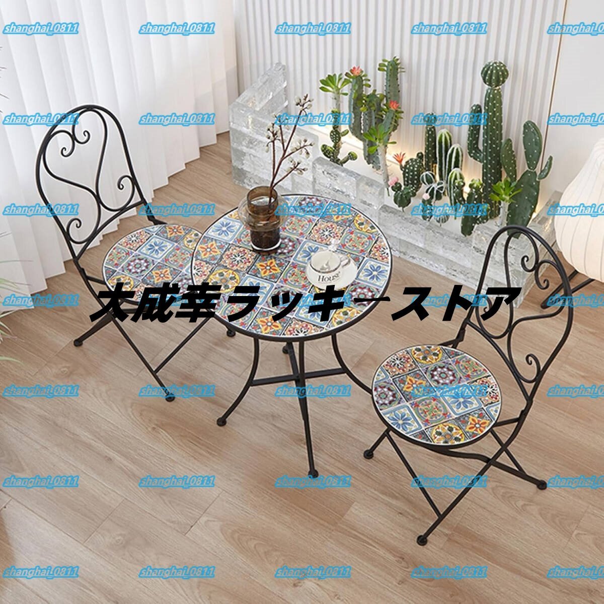 ビストロ3点セット、モザイクセラミックタイル卓上ガーデンテーブルと折りたたみ椅子2脚セット