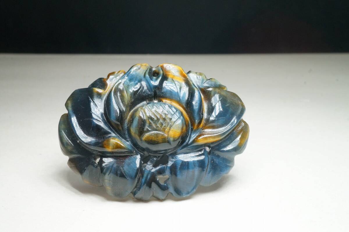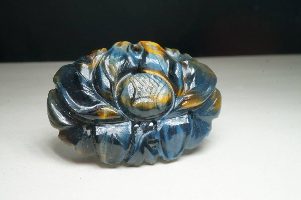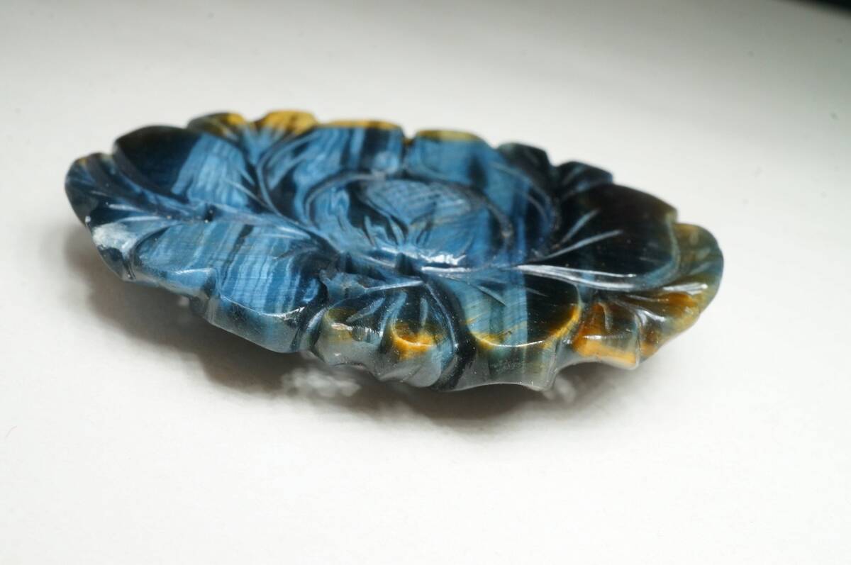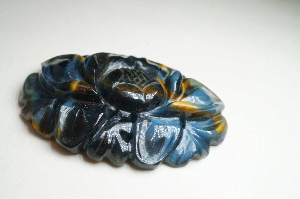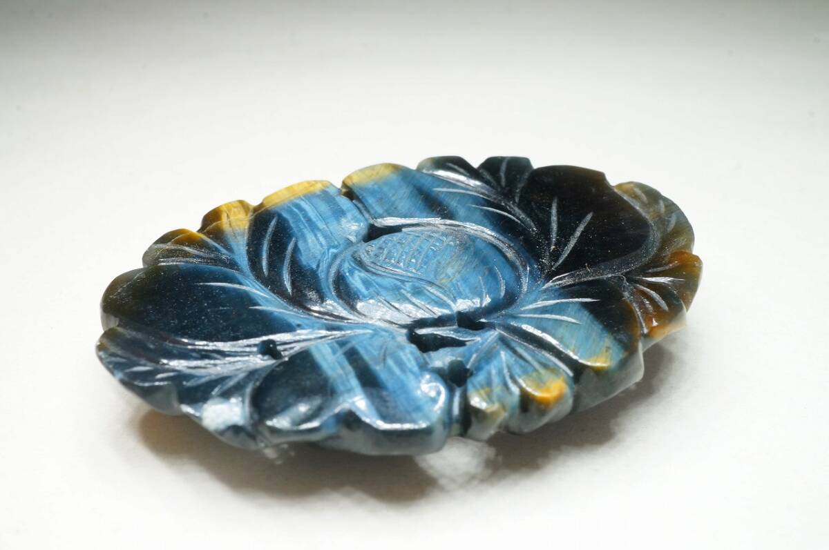 | 希少!30年前の原石を加工彫刻!極上天然紺虎目石タイガーアイ【椿】両面研磨 甲府の職人が彫刻研磨品13g | |||||||||||