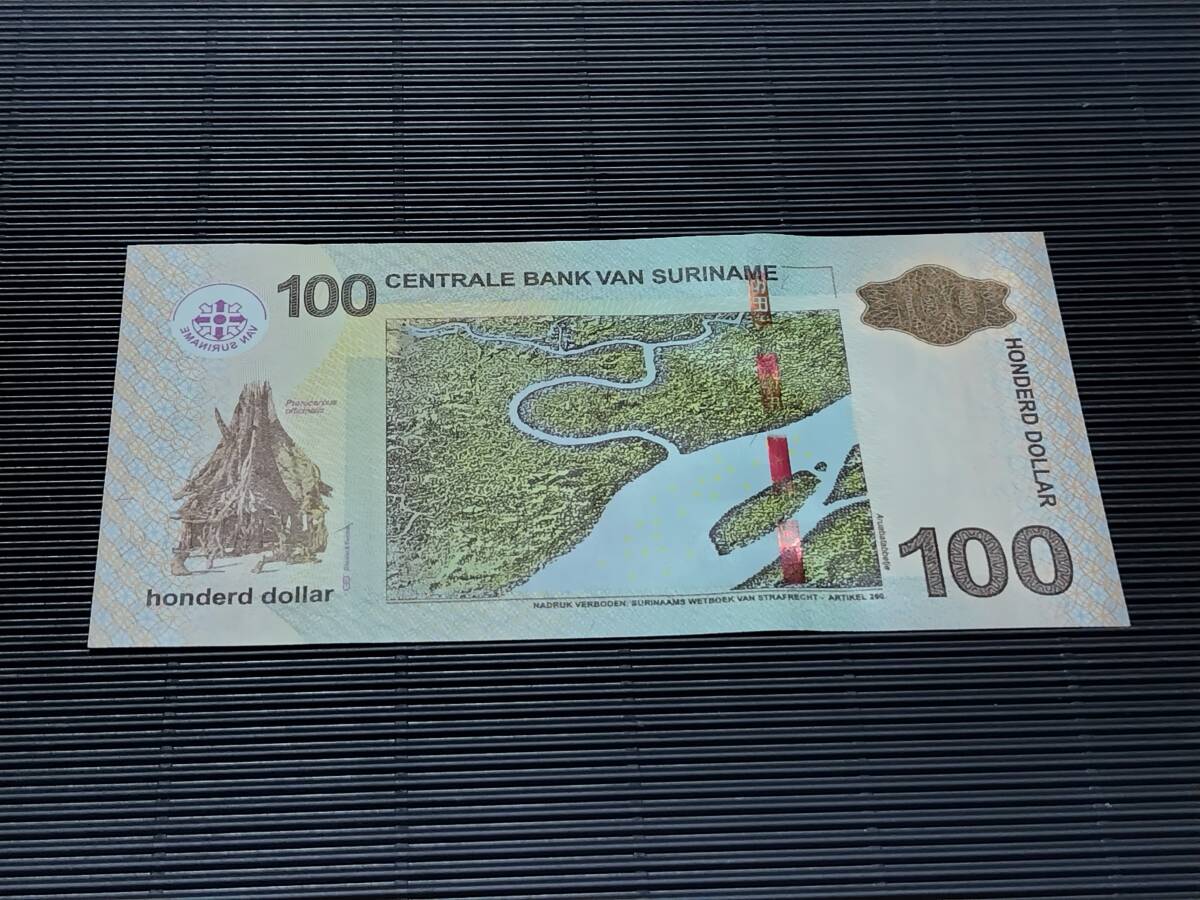 スリナム 100 Dollars札   コレクション向きのピン札  2012年4月1日 未使用~甘い未使用  p-166b  #GU6353592