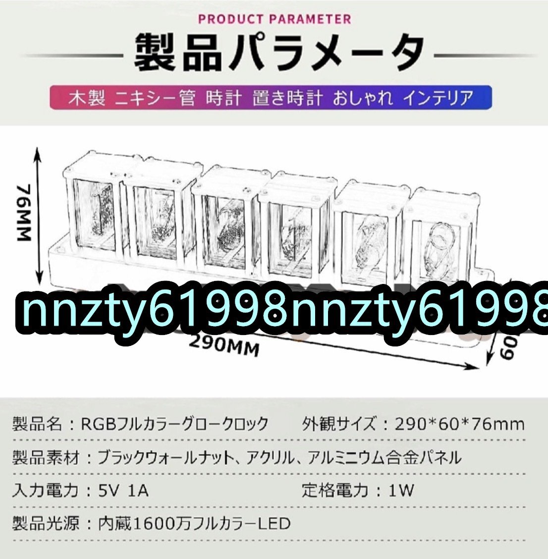 【ニキシー管時計の材質】:時計本体は上質なウォールナット材を使用し、表面が滑らかでラインが美しい。 レトロな木目調の素材は、技術に溢れた発光素材とのコントラストが強く、視覚的なインパクトを与えます。