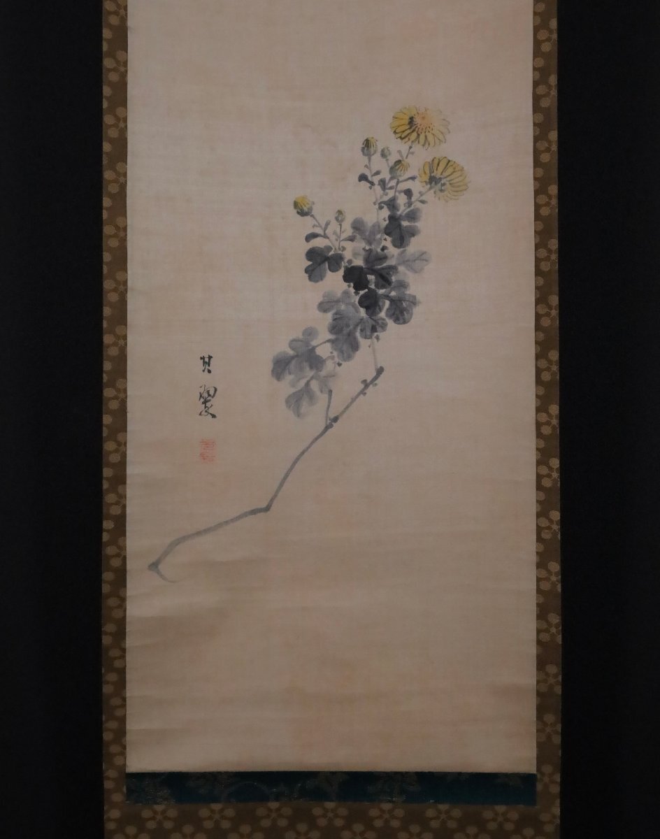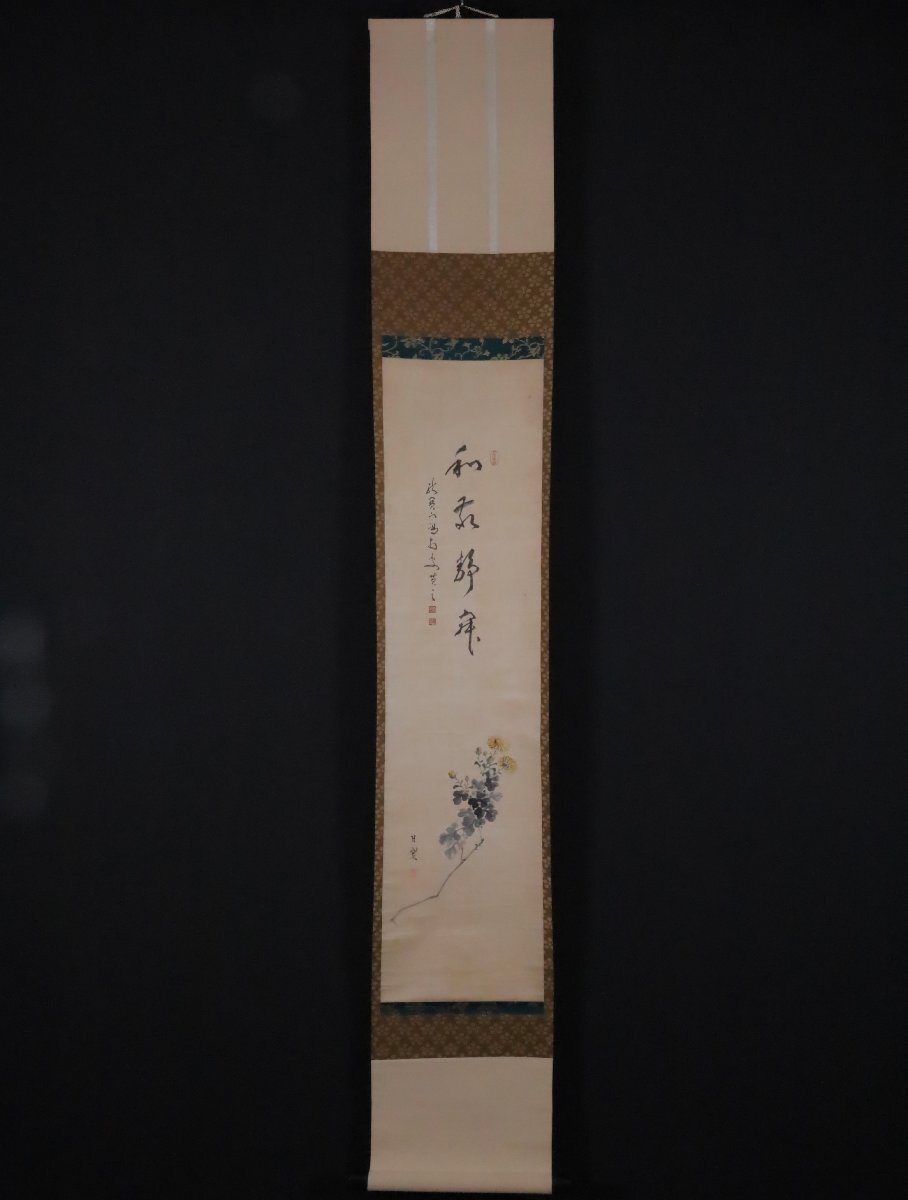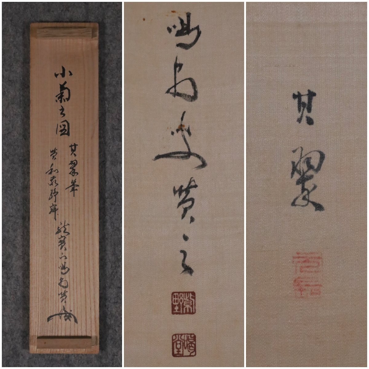【模写】吉】11587 細合喝堂・菅其翠 菊画賛 絖本 共箱 臨済宗 大徳寺 龍源院前住職 仏教 茶掛け 茶道具 四条派 書 掛軸 掛け軸 骨董品