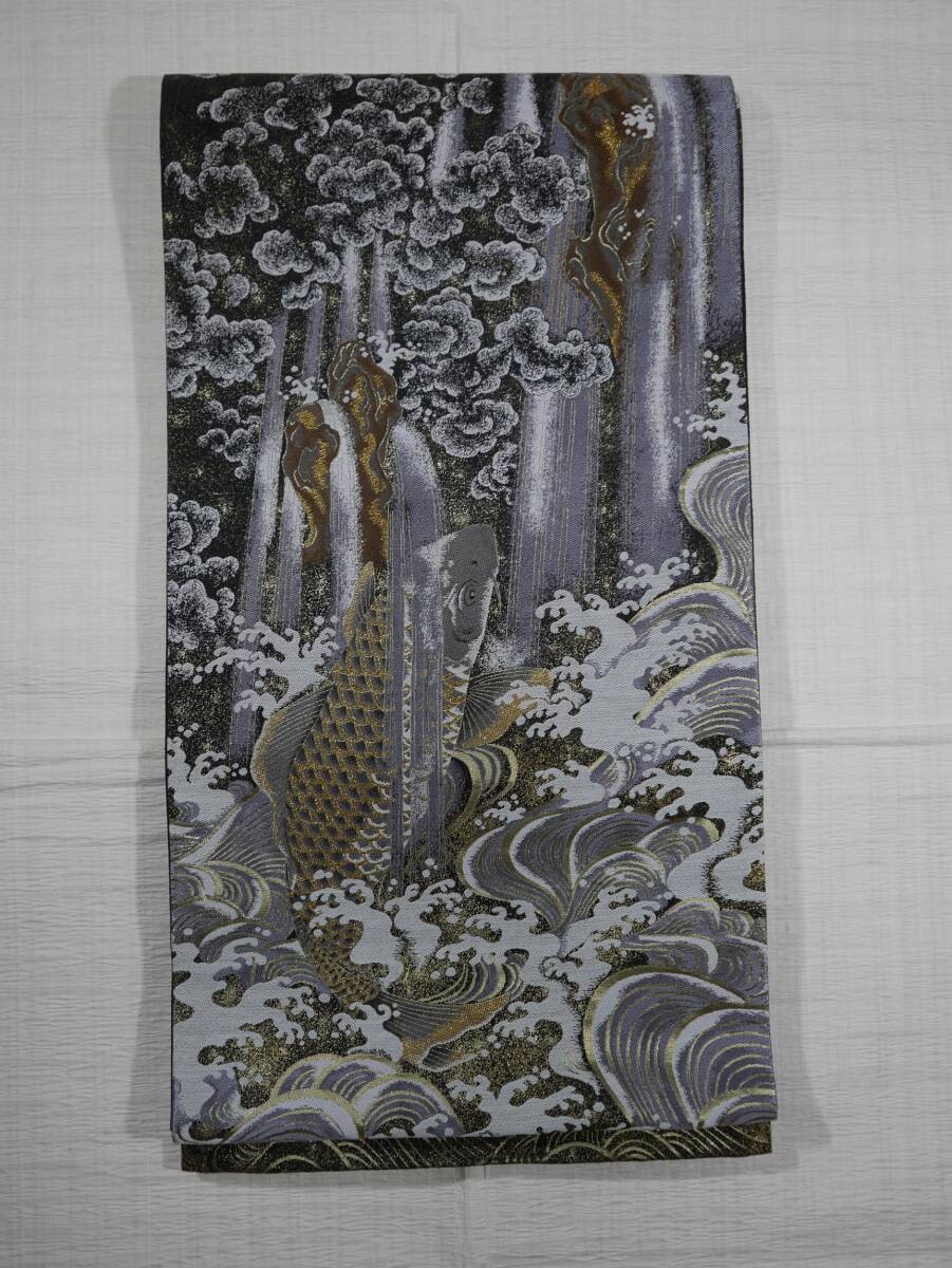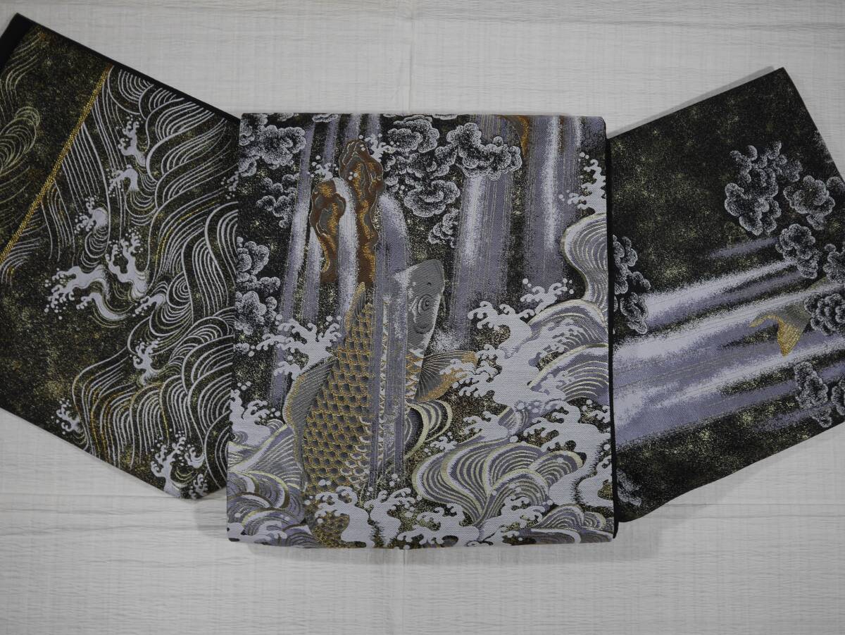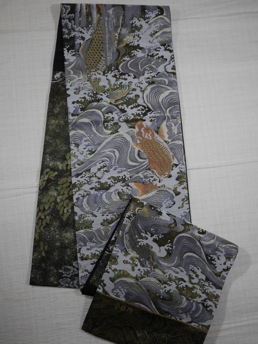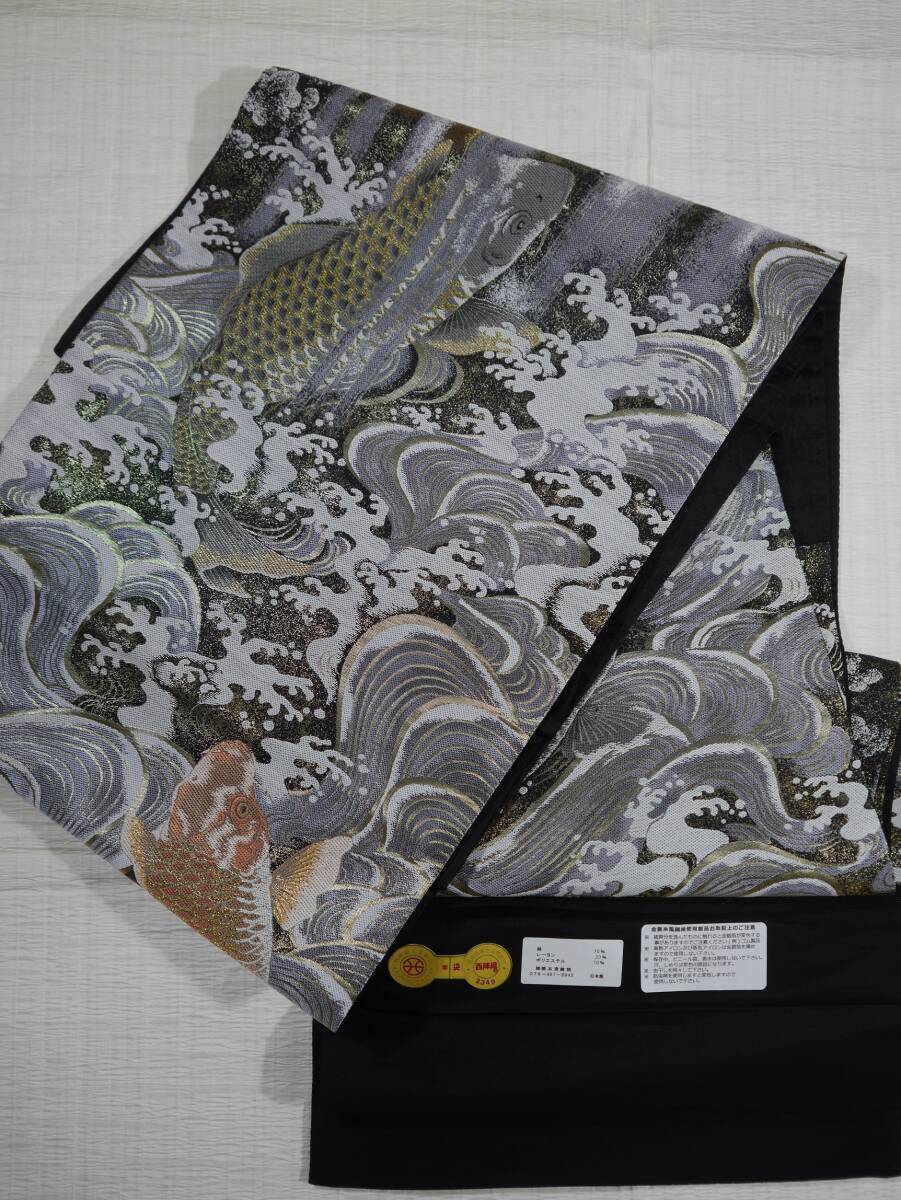 西陣織の老舗橋本清織物より急流を舞い昇る鯉の力強い袋帯に織りあがっています。龍門を登りきった鯉は龍になるという立身出世の関門を登龍門と言うようになりました。粋なお着物、お洒落なお着物の柄合わせにいかがでしょうか。お仕立てには三河の綿芯を入れ手縫い仕立てを致します。お仕立て上がりには3~5日のご猶予お願い致します。