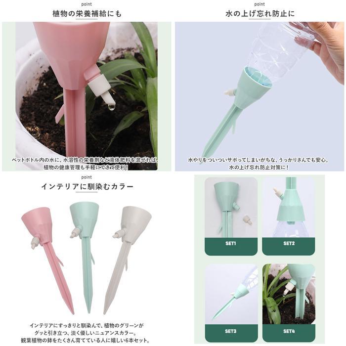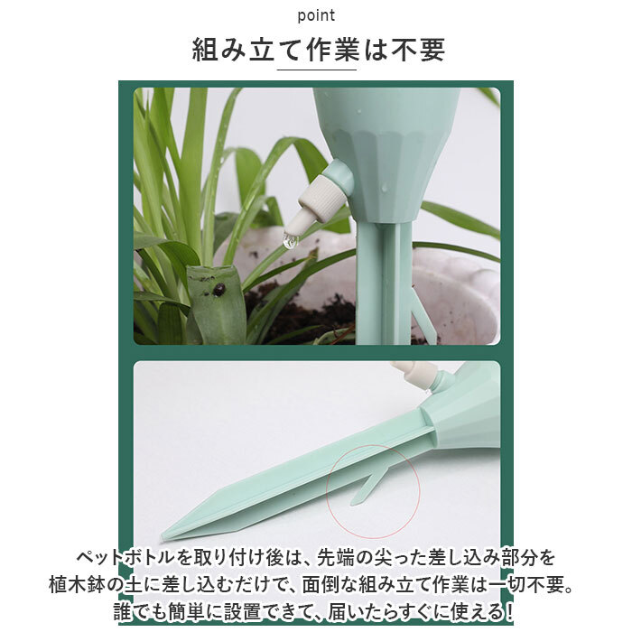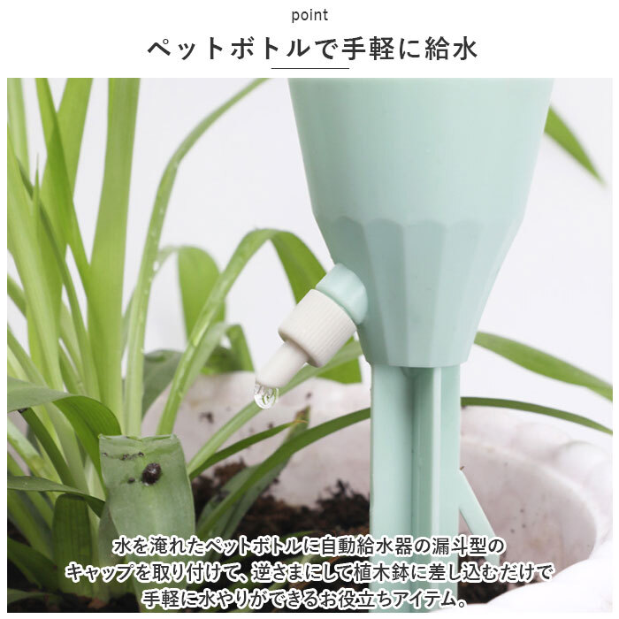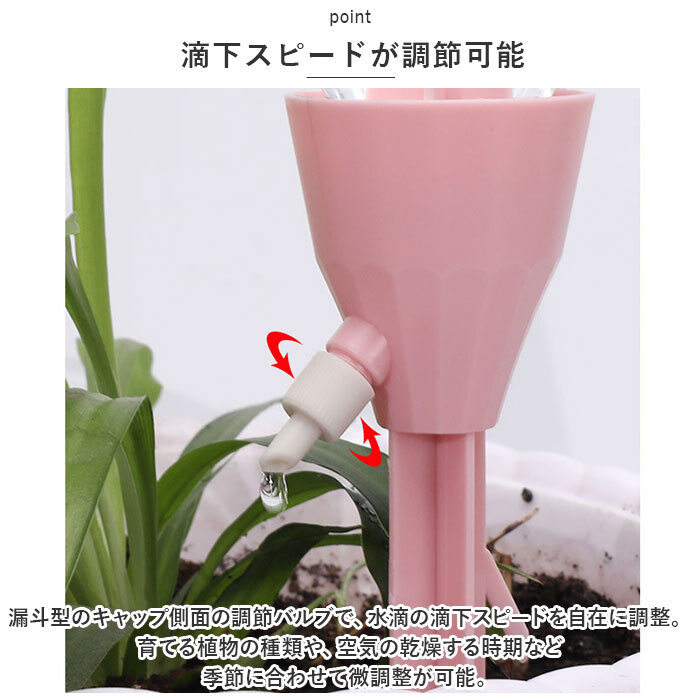 商品説明 | ・・旅行や外出で留守の間も、大切な植物に自動で水やり!植物ポットにちょこんと挿すだけ「自動給水器」が新登場。 ・【ペットボトルで手軽に給水】 ・水を淹れたペットボトルに自動給水器の漏斗型のキャップを取り付けて、逆さまにして植木鉢に差し込むだけで手軽に水やりができるお役立ちアイテム。 ・【さまざまなペットボトルに対応】 ・口径25mm~30mmのさまざまなペットボトルに対応。容量も500mlや700mlなど、外出期間や植木鉢の大きさに合わせて使い分けができるのが嬉しいポイント。 ・【滴下スピードが調節可能】 ・漏斗型のキャップ側面の調節バルブで、水滴の滴下スピードを自在に調整。育てる植物の種類や、空気の乾燥する時期など季節に合わせて微調整が可能。 ・【組み立て作業は不要】 ・ペットボトルを取り付け後は、先端の尖った差し込み部を植木鉢の土に差し込むだけで、面倒な組み立て作業は一切不要。誰でも簡単に設置できて、届いたらすぐに使える! ・【植物の栄養補給にも】 ・ペットボトル内の水に、水溶性の栄養剤など液体肥料を混ぜれば、植物の健康管理も手軽にできて便利! ・【水の上げ忘れ防止に】 ・水やりをついついサボってしまいがちな、うっかりさんでも安心。水の上げ忘れ防止対策に! ・【インテリアに馴染むカラー】 ・インテリアにすっきりと馴染んで、植物のグリーンがグッと引き立つ、淡く優しいニュアンスカラー。観葉植物の鉢をたくさん育てている人に嬉しい6本セット。 |
