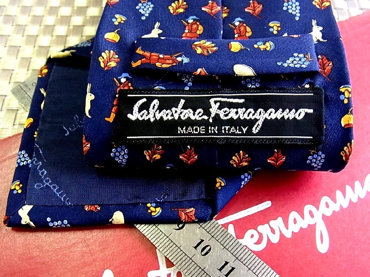 ★RB3399★【人 兎 うさぎ 動物 ブドウ 葉っぱ 植物 柄】フェラガモ【美品】ネクタイ