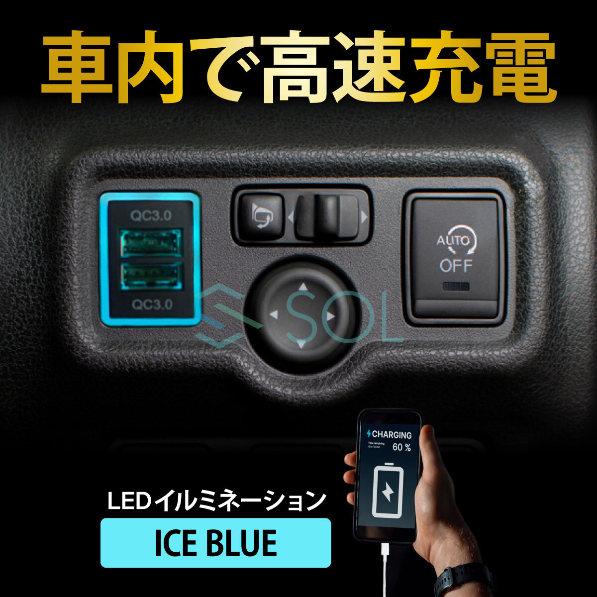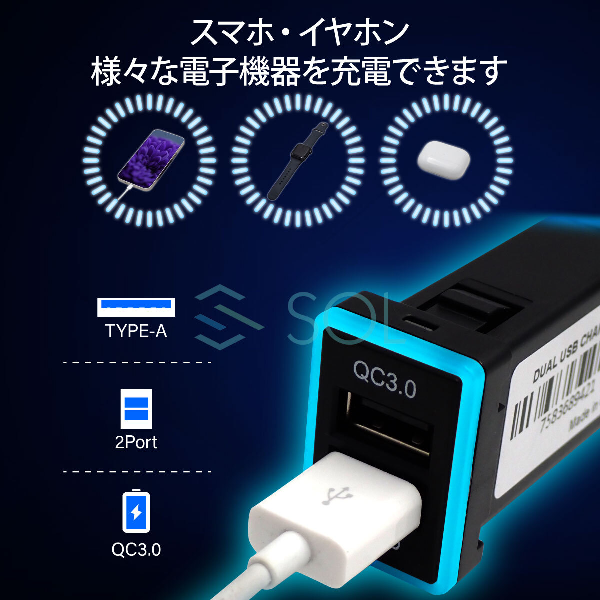 USBポート プリウス トヨタ 全般 汎用 TYPE-A 2ポート 急速充電 増設 QC3.0 LED アイスブルー 充電 サービスホール タイプA カプラー