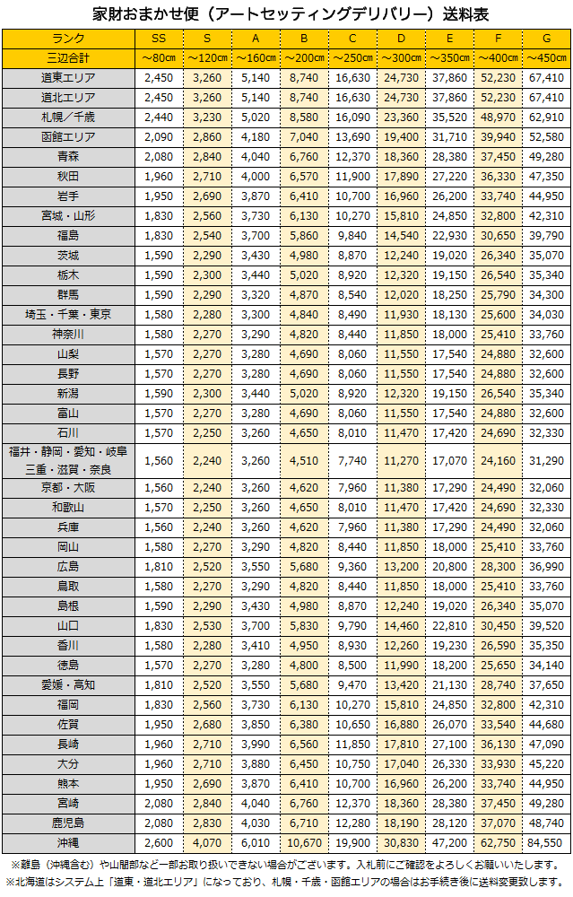 【らくらく家財宅急便】 ※運送会社は、ヤマトらくらく家財便になります。 ※商品の代引き発送、送料着払いは出来ません。 ※らくらく家財便での保険加入は必ずさせて頂いており、料金に関しましては当店にてご負担させて頂いております。 ※商品の到着は、地域により異なりますが、入金日から5~10日後になります。 ※配達日指定のご希望がある場合は、落札後その旨お知らせ下さい。(配達地域によっては日時指定をお受けできない場合があります。) ※ベッドや組立家具は、分解して発送となる場合がございます。その場合、到着後の組立が必要となりますが、中古家具の為、説明書や工具は付属いたしません。 ※お届け先が離島の場合、別途送料が必要となる場合があります。 ※商品配送は、基本的にご希望の設置場所までの配送となっておりますが、玄関口やお部屋に入らない場合は吊上げ作業が必要となる場合がございます。その際の費用は落札者様ご自身でのご負担となります。 SS:80cmまで S:120cmまで A:160cmまで B:200cmまで C:250cmまで D:300cmまで E:350cmまで F:400cmまで G:450cmまで】 ![]() ※ヤマト運輸らくらく家財宅急便送料はこちらからもご確認頂けます。 |