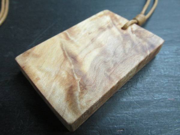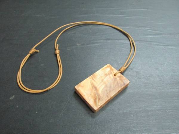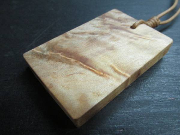 楓は非常に生命力の強い木です。他の木ならば致命的になってしまう損傷を受けても、驚異的な生命力で再生します。楓のこの生命力は、材となっても残存し、身に起こった異変を何とか修復しようと大きくねじれ、反り、割れを引き起こします。楓のこの強靭な力を鎮めるには暴れるだけ暴れさせるより他ありません。鎮まった楓の厚板から部材を木取りし、製品にしていきます。この杢の美しく入った楓を使ってペンダントを作りました。
