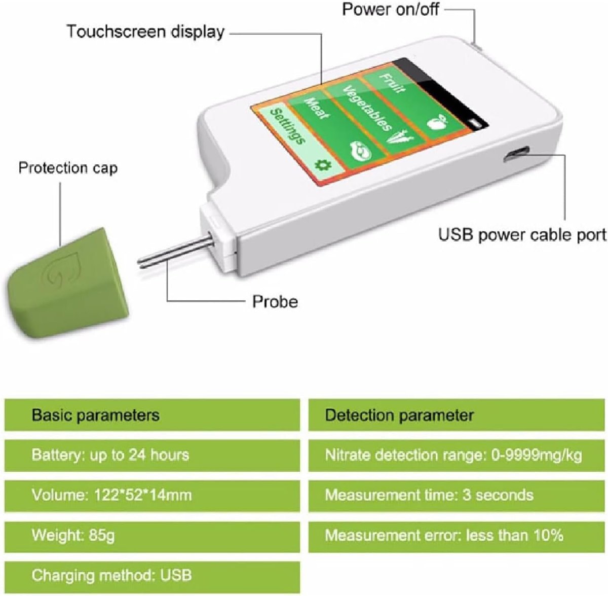 【使いやすい】:高解像度のカラーディスプレイは使いやすいインターフェースを提供し、独自の硝酸塩および直感的なテストソフトウェアと組み合わせて、果物や野菜の品質と安全性を迅速にチェックできます。