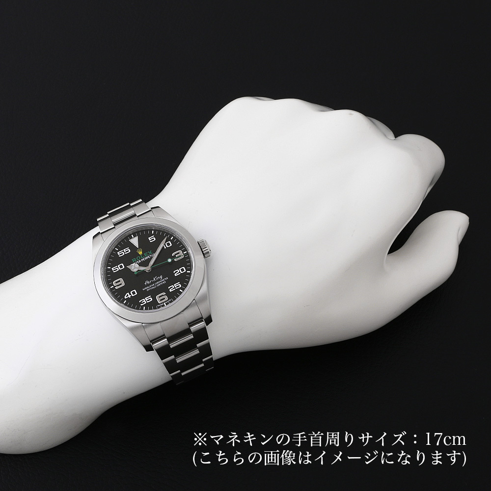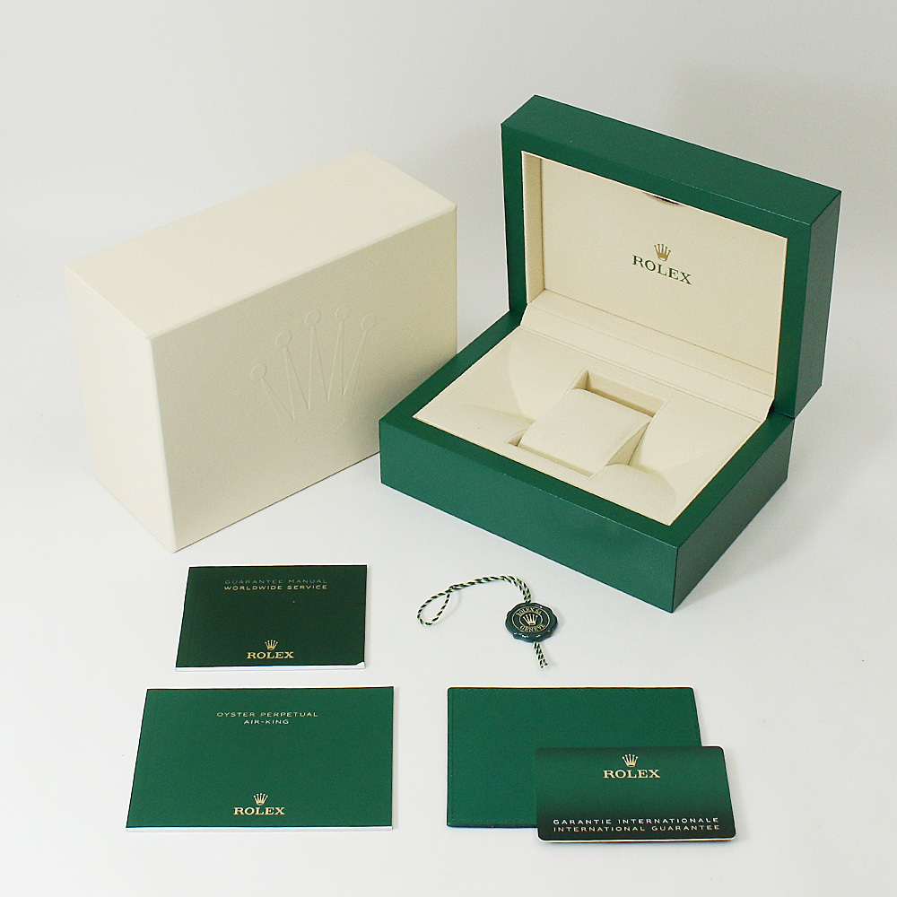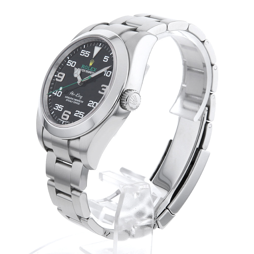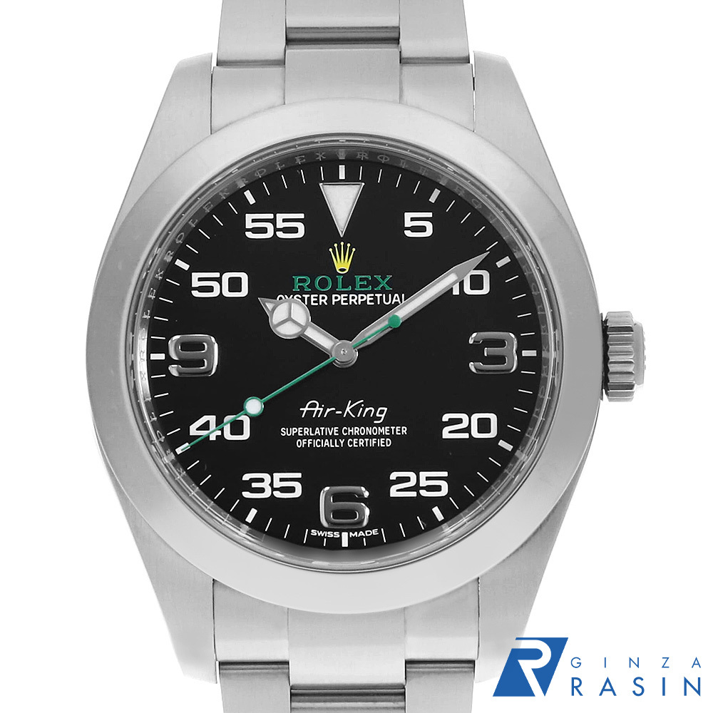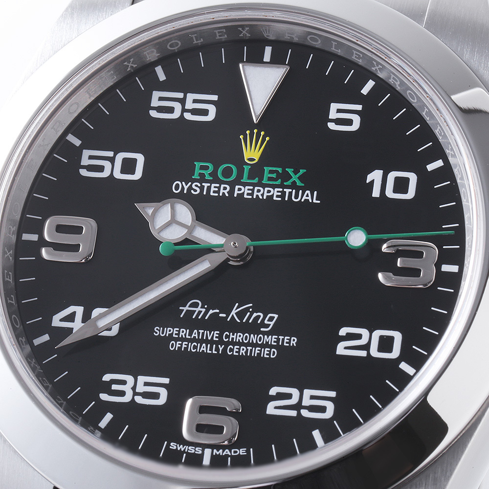 | モデル情報 | 2014年に製造終了となったエアキングですが、2016年にエアキング Ref.116900 としてリニューアルして帰ってきました。ケース径は40mmへと大幅サイズアップ。ムーブメントはCOSC認定のCal.3131を搭載。秒針はコーポレートカラーであるグリーンにカラーリングされ、ブラックダイアルとの組み合わせが印象的です。12・3・6・9時以外の二桁のアラビアインデックスがスタイリッシュさを演出します。 |