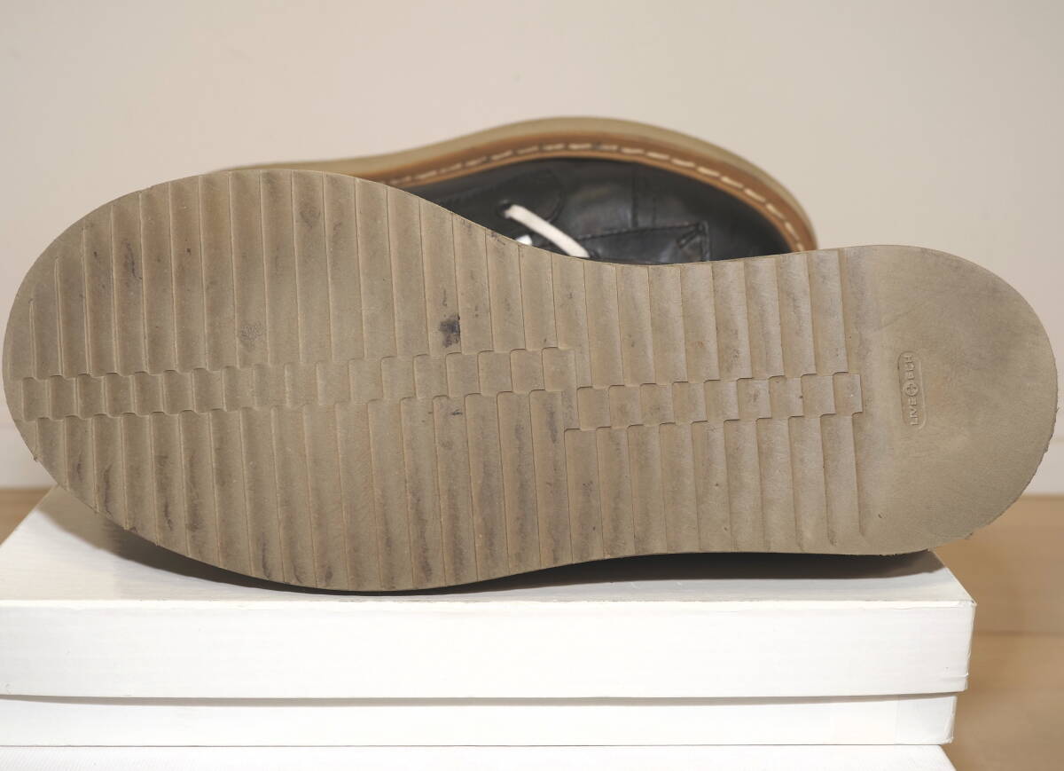 大きめハトメの配されたデザインのローカットのレザーシューズです。厚めのソールのつくりです。