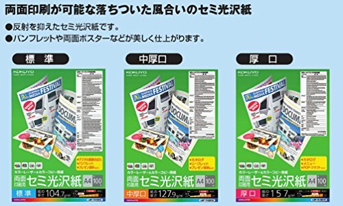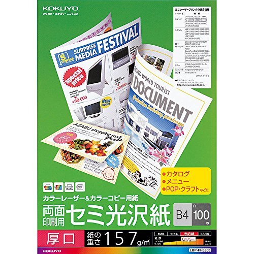 157g/m2・ホワイト B4 ・・Size:B4・【用紙寸法】 364×257mm・【サイズ】 B4 【紙厚】 157g/m2 0.17mm・【枚数】 100枚 【仕様】 両面印刷用紙/厚口●反射を抑えたカラーレーザー・カラーコピー用のセミ光沢紙です。 ●パンフレットや両面ポスターなどが美しく仕上がります。 ●用紙厚さ157g/m2以上に対応する機種でお使いください。 ●印刷部分の光沢感は、お使いのプリンタ機種により異なります。