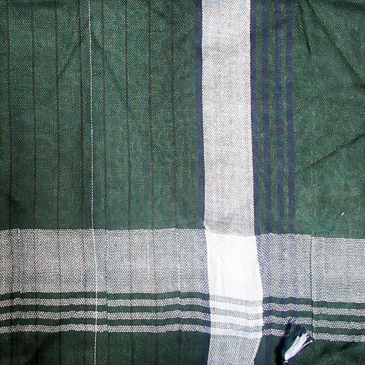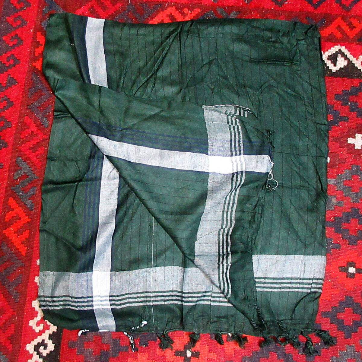 ●濃く深いモスグリーン色地に白とピンストライクの黒のラインが印象的なスカーフです●サイズ:1,050×1,050(フリンジ含まず)、綿*アフガニスタン雑貨の布製品は手作り品のため1点ごとにサイズ・色の違い、また織り傷やスジなどがある場合がありますが、手作り品としての味とご理解のうえ検討ください