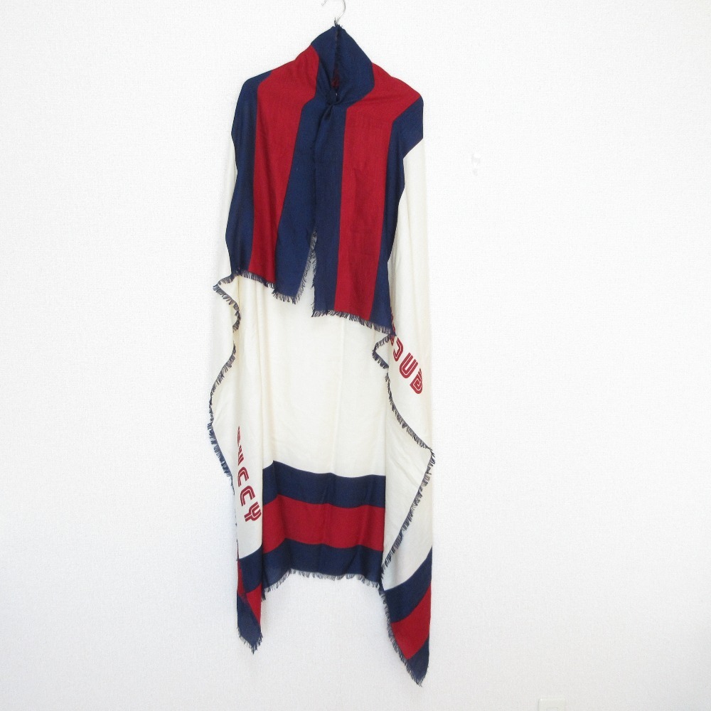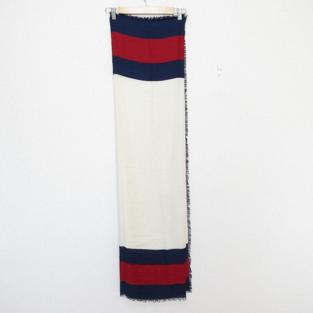 良品 GUCCI グッチ GUCCY シェリーライン 大判ストール ショール ベージュ×ネイビー×レッド