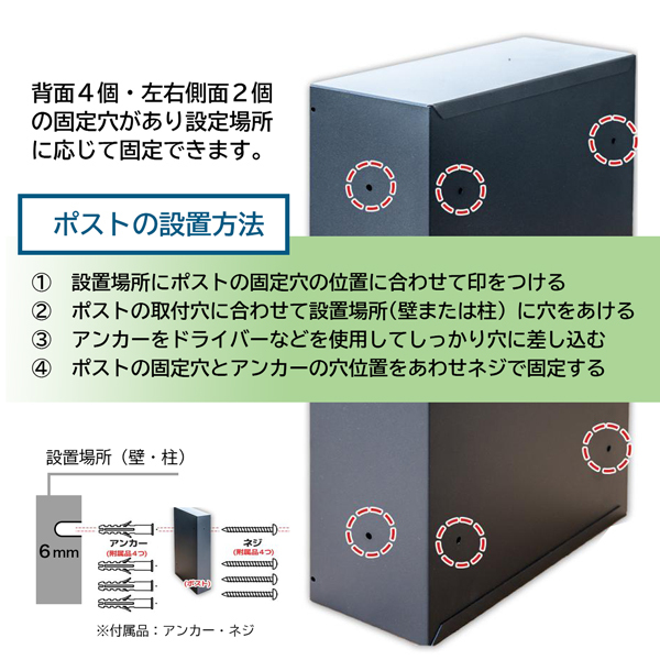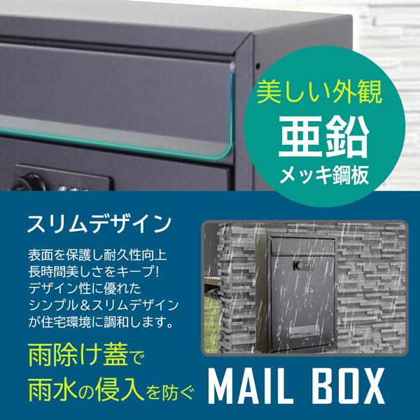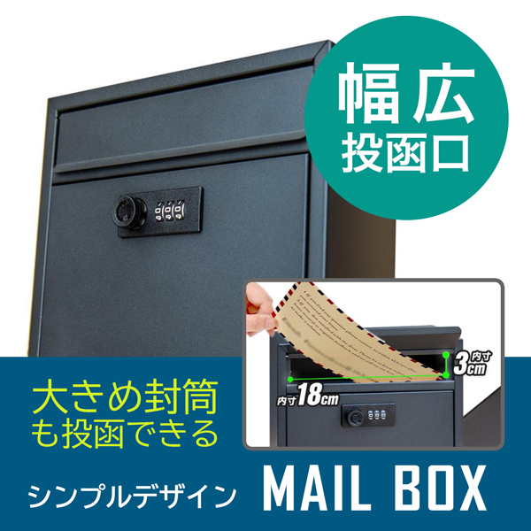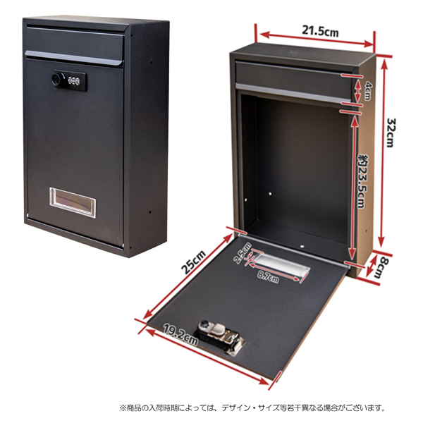 | ★ダイヤルロック機能付き郵便ポスト★ 郵便ポスト ダイヤルロック機能付き 【ポイント】 いつでも変更可能な3桁暗証番号/ダイヤルロック機能付きで万全のセキュリティー対策! ダイヤルロックは盗難やイタズラから郵便物を守ります。 投函口が大きいので大きな封筒やメール便なども投函しやすく、扉が大きく開くので取り出す際も楽々! 雨除け蓋でポスト内部に雨水が侵入しにくい構造になっています。 ※折った新聞など硬く柔軟性がない郵便物は投函口から入らない場合があります。 ※雨水などが入りにくい設計になっていますが完全防水ではございません。 【商品名】 郵便ポスト ダイヤルロック機能付き 【商品番号】 post-yy-tx0020 【商品仕様】 本体サイズ:約215×320×80mm 投函口サイズ:約(W)180×(H)30mm 材質:亜鉛メッキ鋼板 カラー:ブラック 重量:約1.23kg 付属品:アンカー、ネジ 【注意事項】 ※取扱説明書は付属していません。 ※輸入品につき本体に僅かなキズ・スレ・さび汚れなどがつく場合があります。 ※入荷時期により予告無くデザイン・色・サイズなど、細かな仕様が変更される場合がございます。 ※色合いの感じ方には個人差があり、撮影状況・PC環境により色合いが異なる場合がございます。 ※細かい点が気になる方、神経質な方はご注文お控えください。 ご注文前に必ずご確認下さい ⇒ お買い物ガイド |
