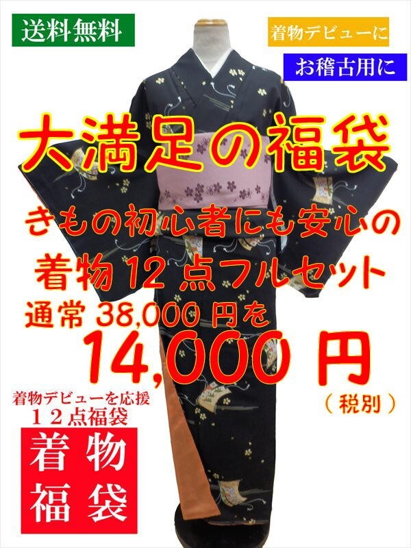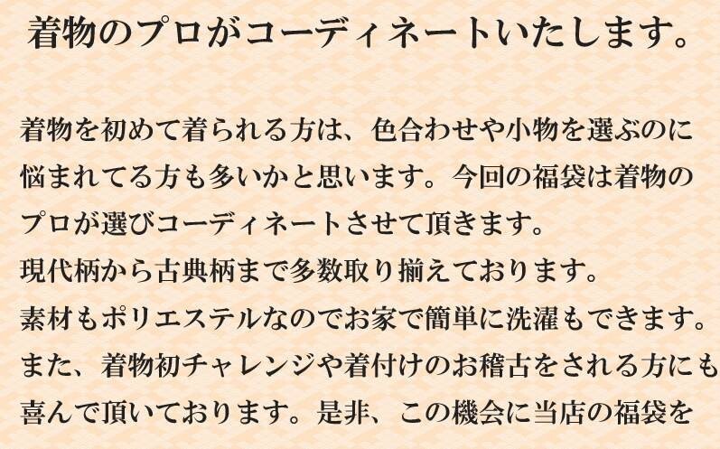 | セット内容 | 着物1枚+長襦袢1枚+四寸帯1枚+草履1足+小物セット(肌襦袢・前板・伊達締め・腰紐3本・衿心・足袋) |