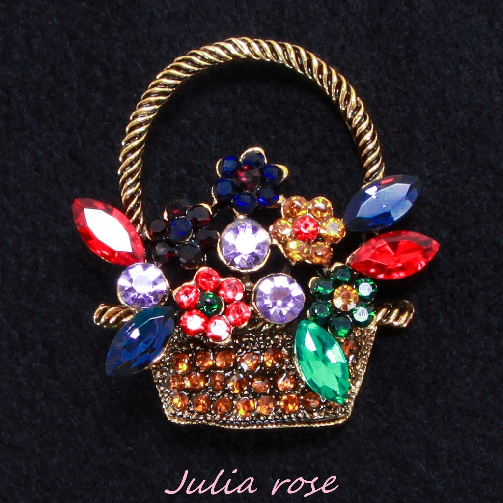 アンティーク風かわいい花籠のブローチ 色とりどりの花 ラインストーン 新品 未使用品