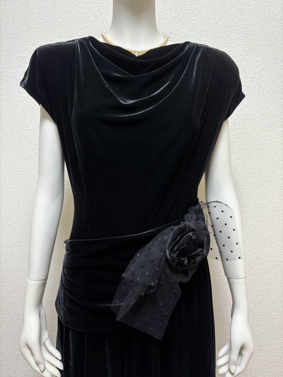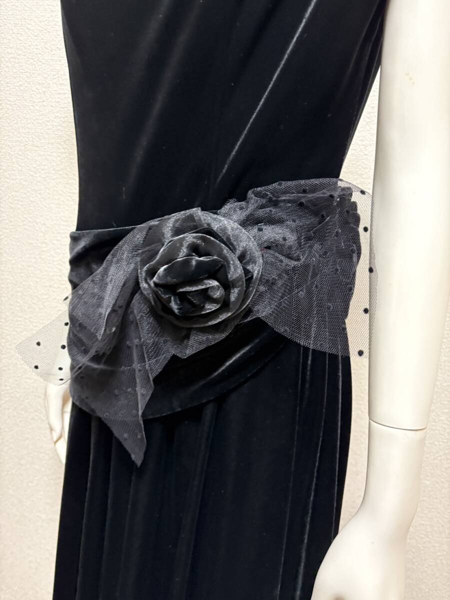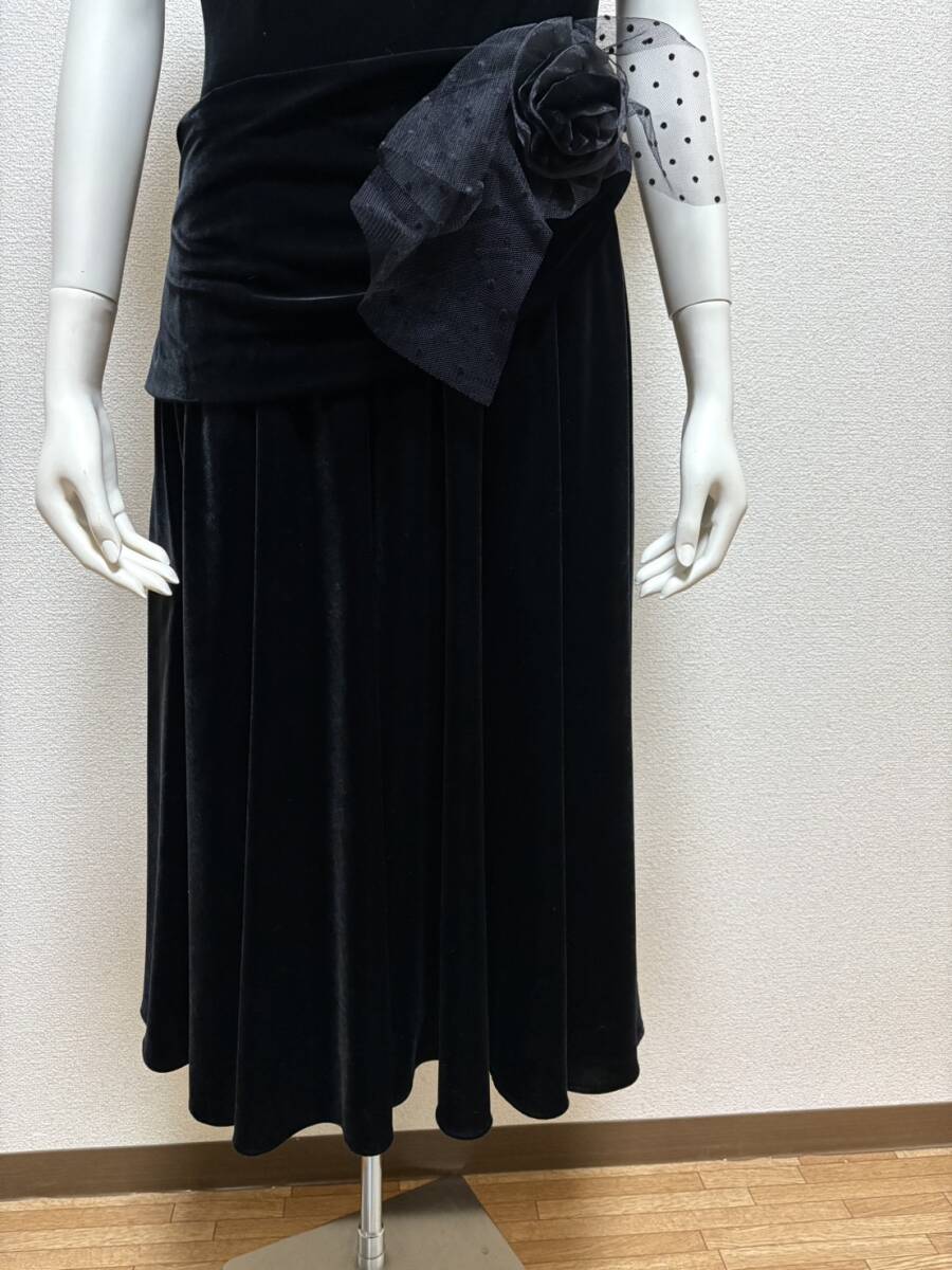 サントネージュ日本製 上質 別珍ベルベットベロア生地ロングドレス ワンピース ウエストリボン付 ブラック黒9号フォーマルパーティードレス