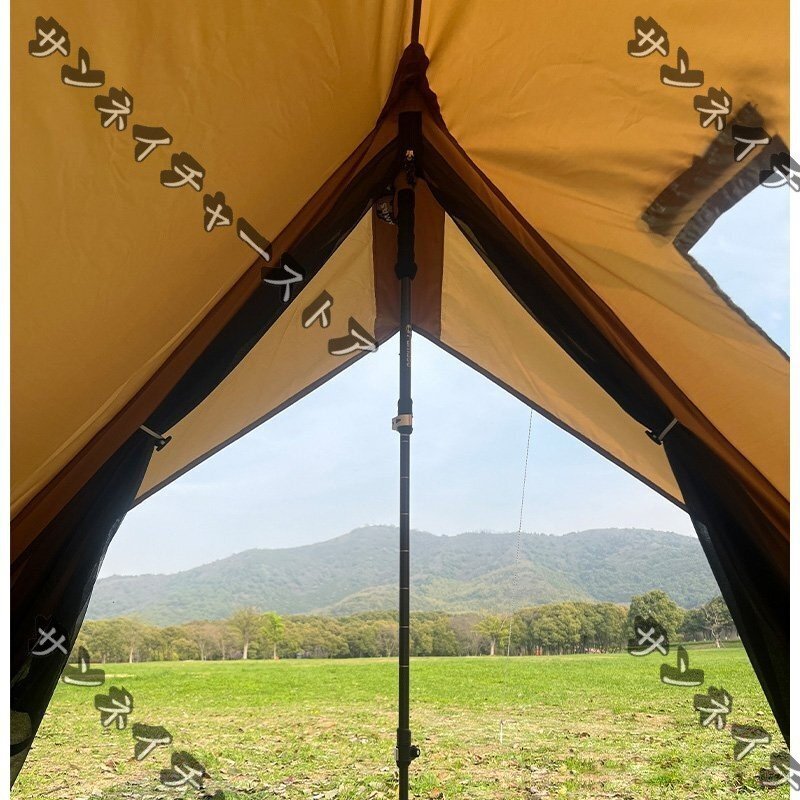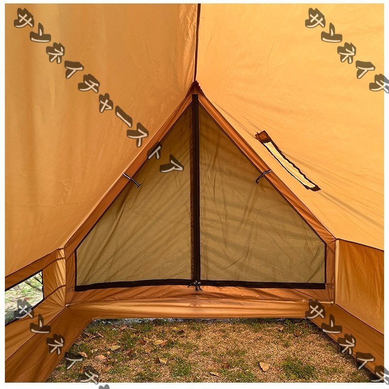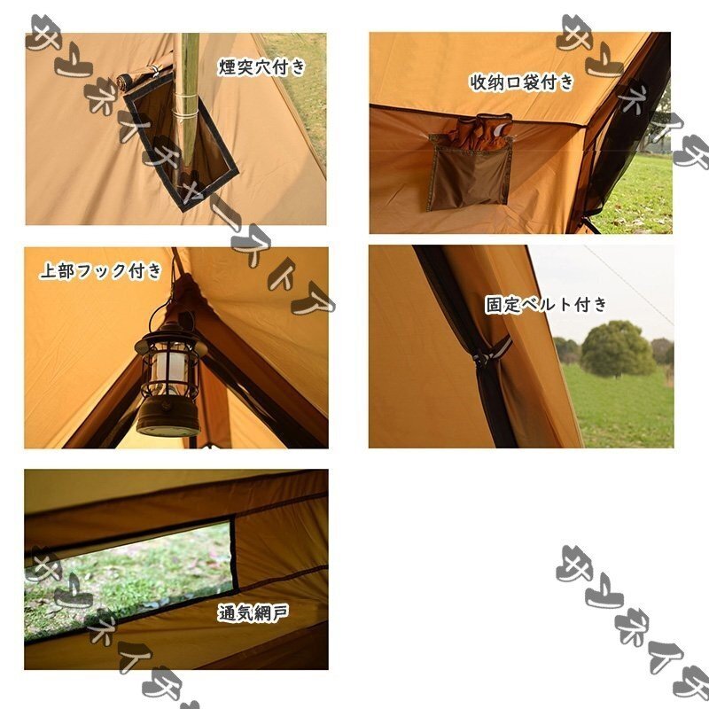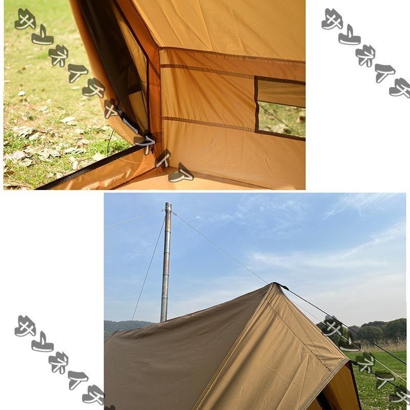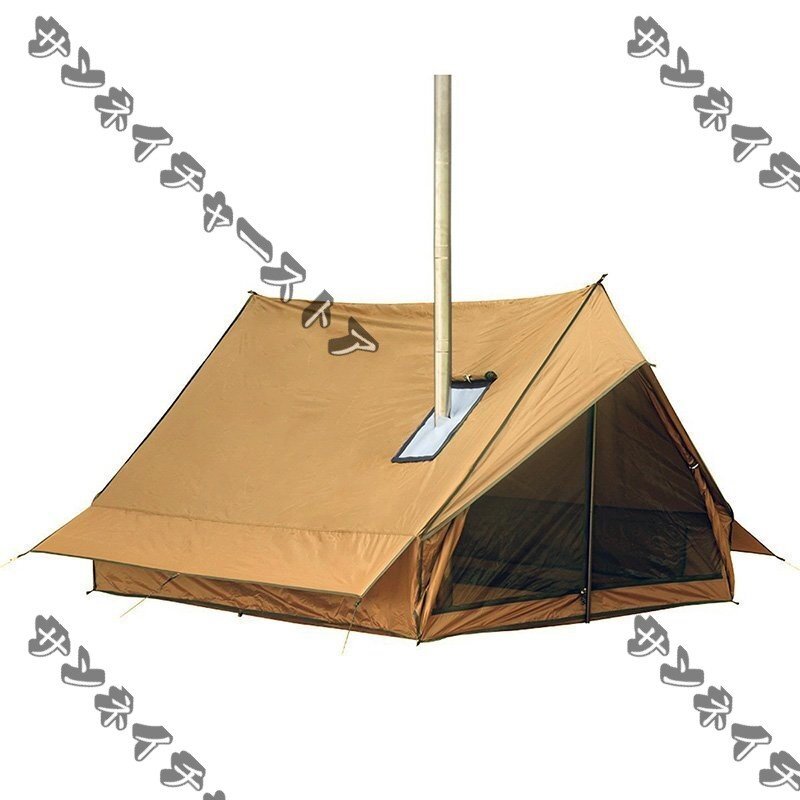 【煙突穴付き・薪ストーブ使用可・通気性のいいテント】煙突付きテントなので、冬でも暖かくキャンプを楽めます。穴部分は耐火性の高いガラス繊維で構成されて、煙突パイプに接触することができます。上部に換気口を配置して、テント内には常に新しい空気が循環します。下部に窓にはメッシュパネルが装備されていて虫除けに最適です