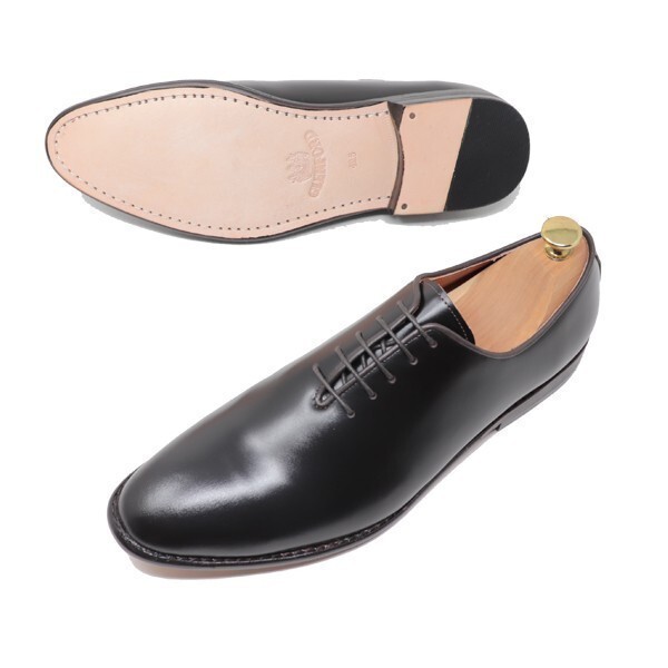 ホールカットシューズとは、通常使用する革より大きな1枚の革でアッパーを包み込むように仕上げ、 縫い合わせが踵部分にしか存在しない大変贅沢なデザインのビジネスシューズです。 質の良い大きな面積の革が必要であり、できるだけシワを出さないよう立体成型するために高度な技術が必要とされます。 このように制作するため手間やコストがかかるためヨーロッパや国内のブランドメーカーなどの高価なものがほとんどであり、 履かれている方も多くはいない大変貴重なデザインで、当店の自信作です。