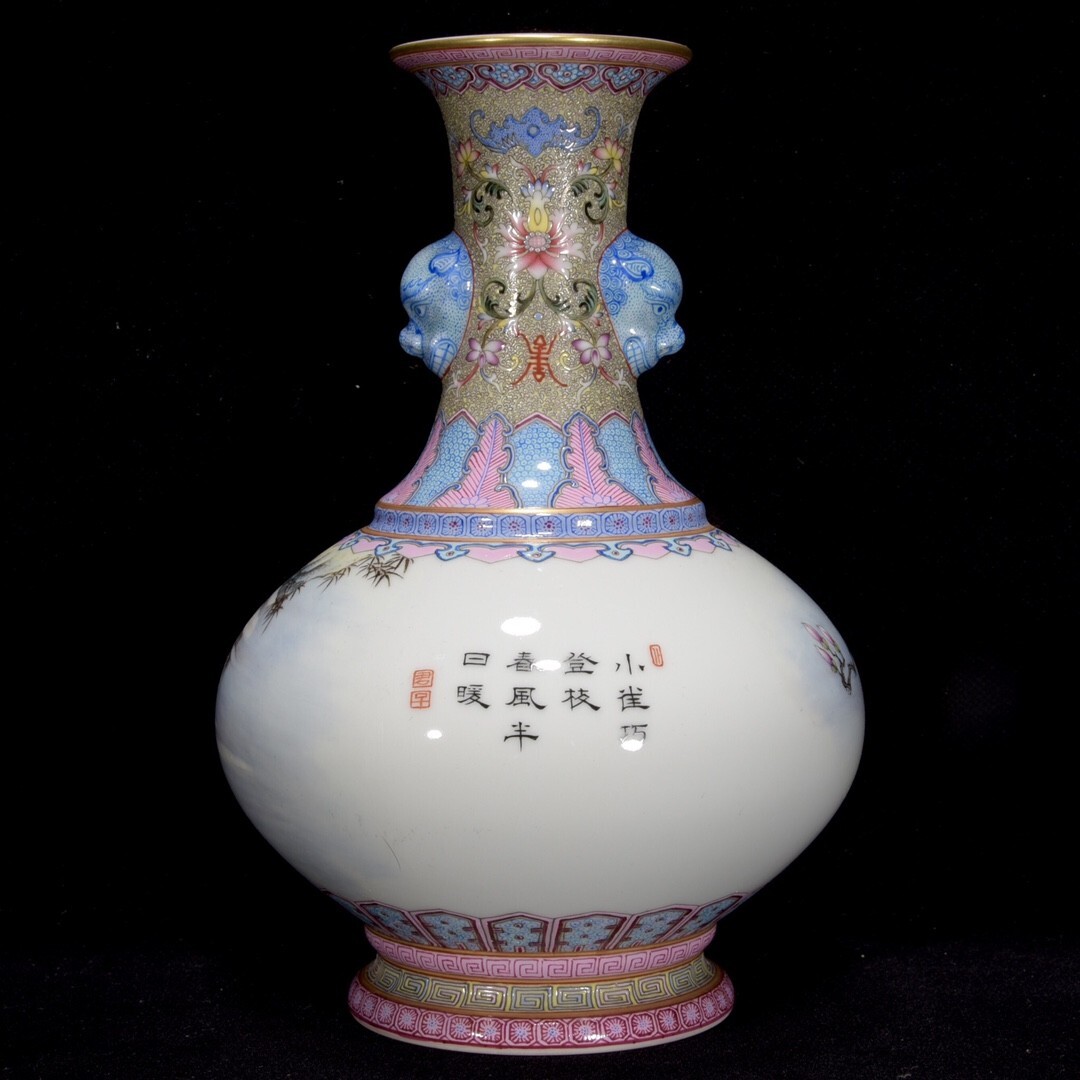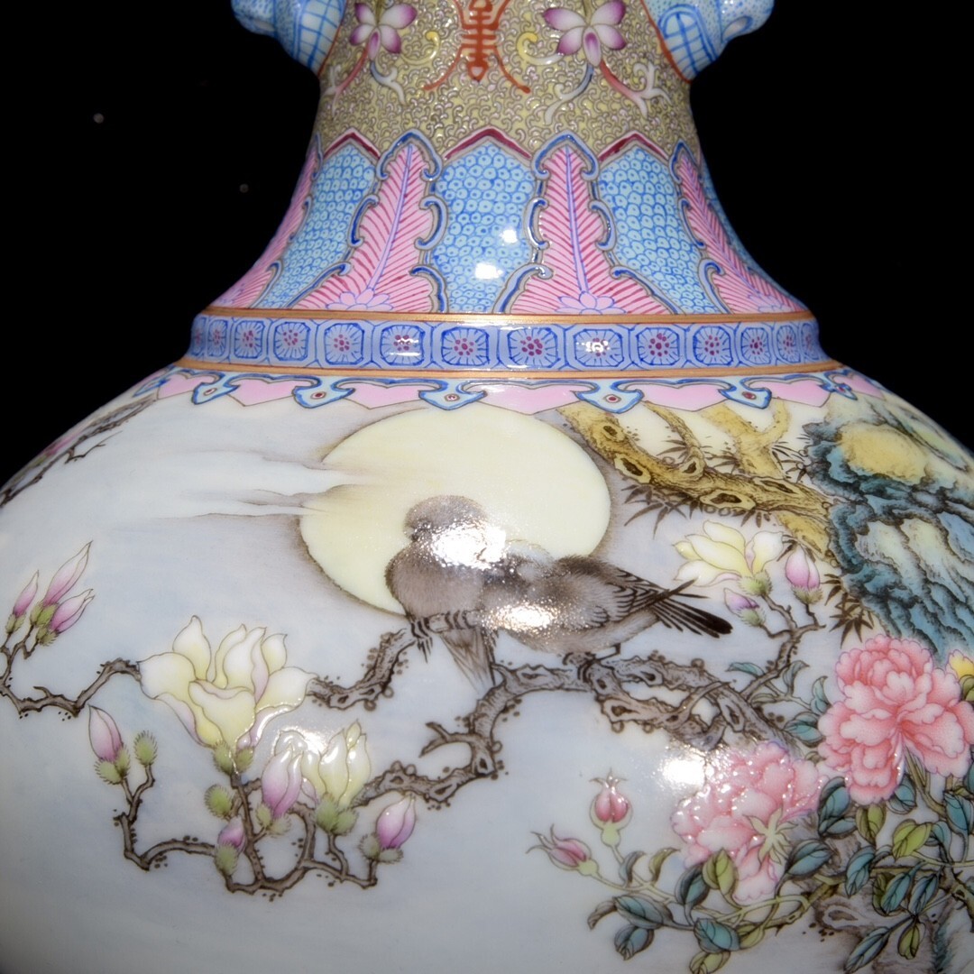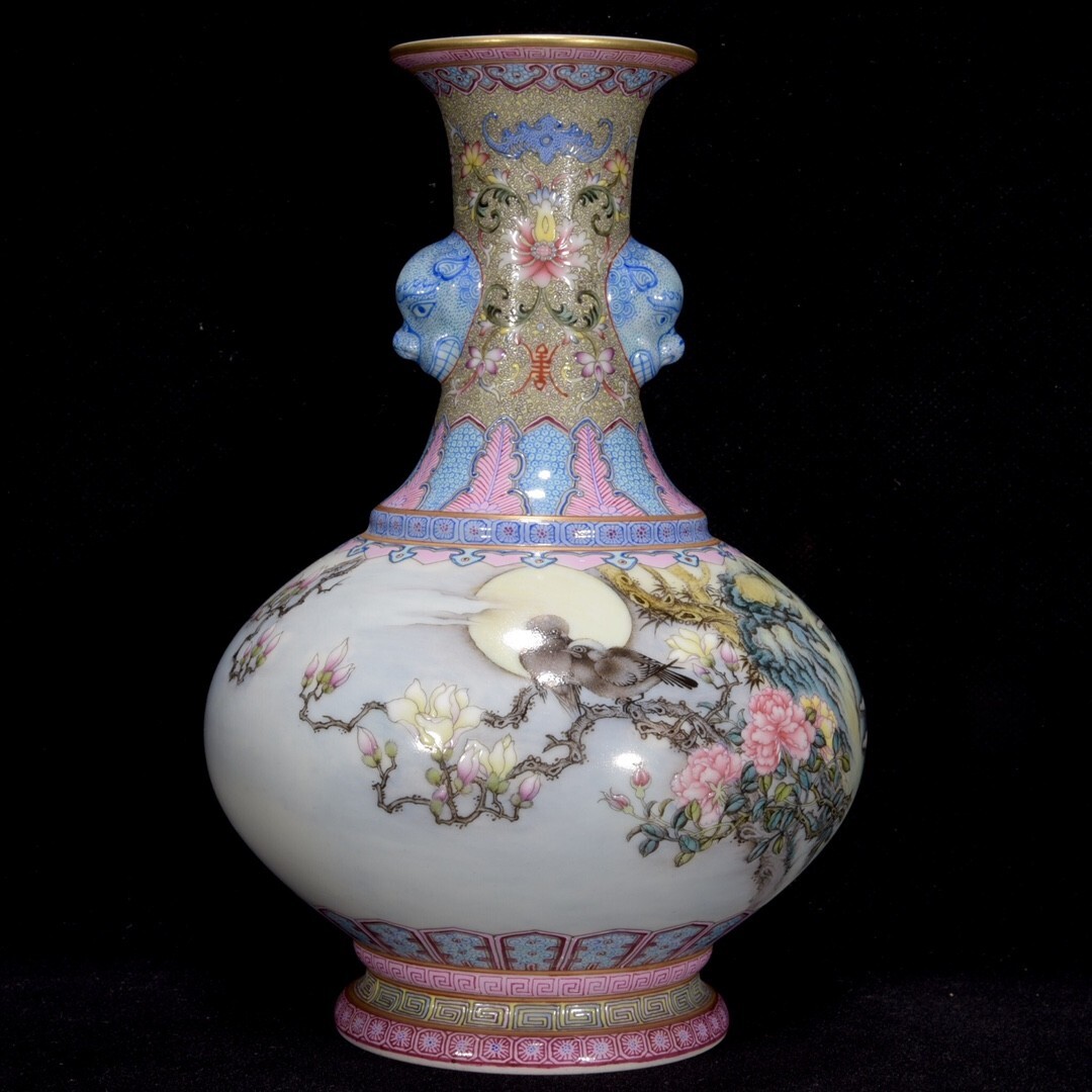清代 大清乾隆年製 陶磁器 古月軒麻雀獣頭双耳瓶【仁】染付 置物擺件 古賞物 古美術 中国古玩 蔵出