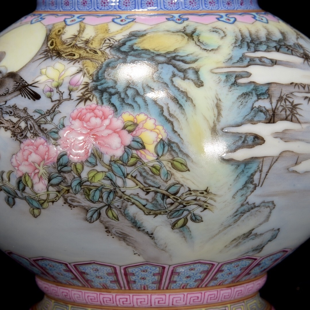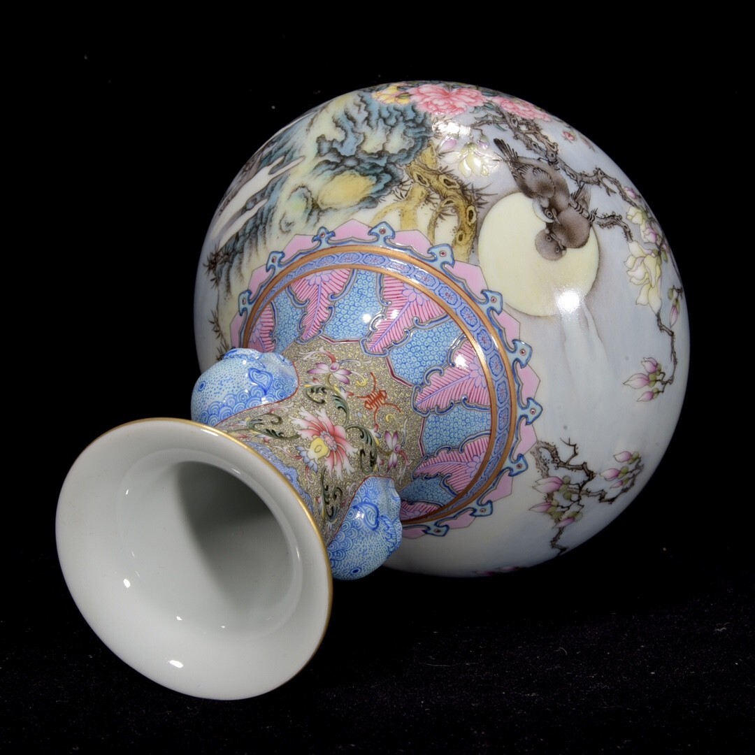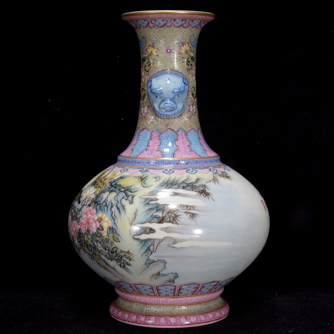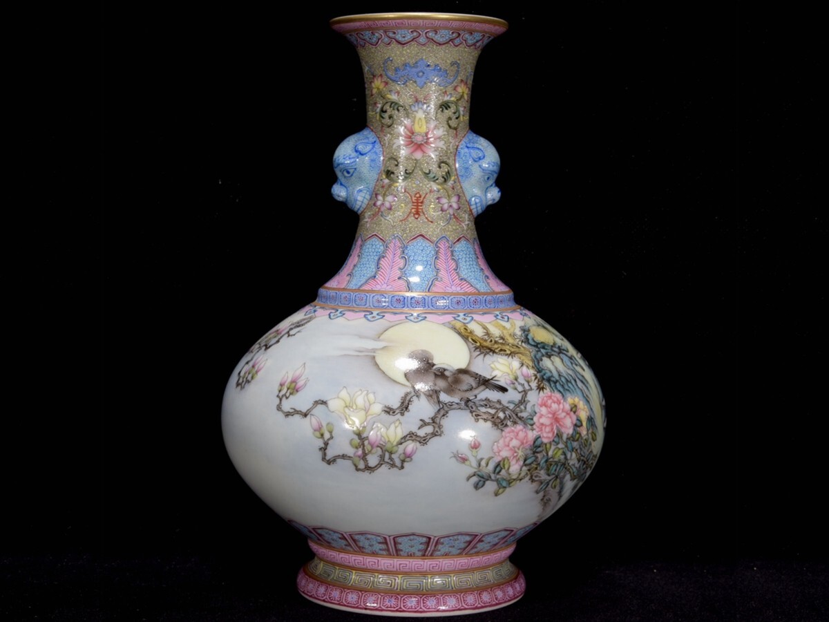 清代 大清乾隆年製 陶磁器 古月軒麻雀獣頭双耳瓶【仁】染付 置物擺件 古賞物 古美術 中国古玩 蔵出