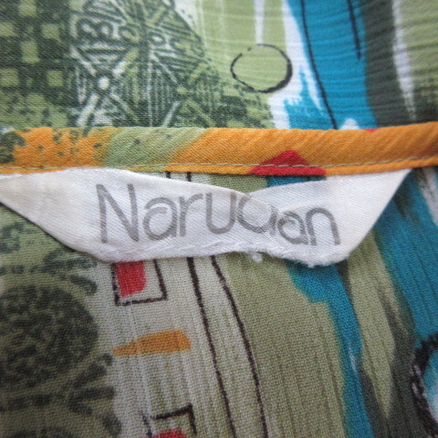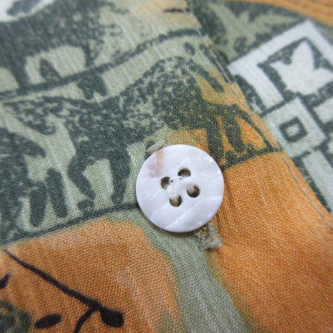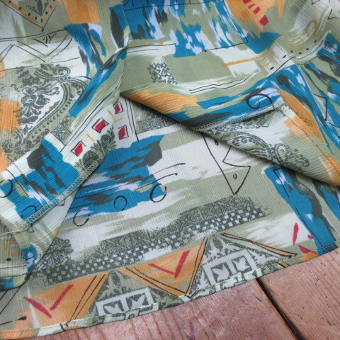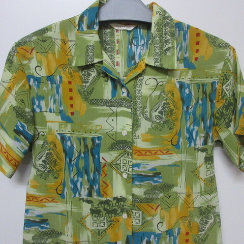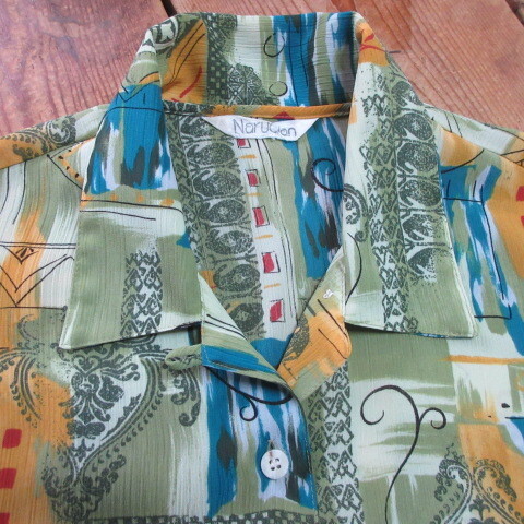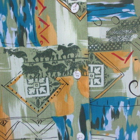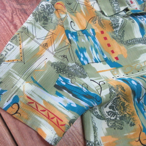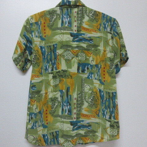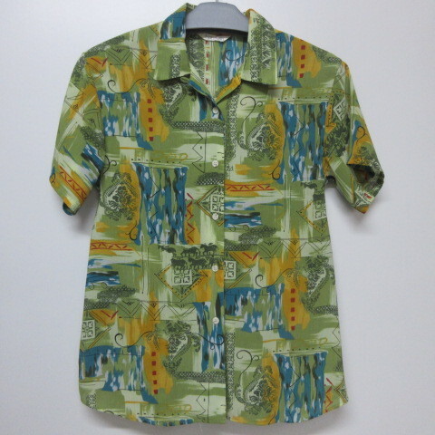 ★Size L? (表記 なし)肩幅 42cm, 身幅 42cm , 着丈 66cm,袖丈 19cm ★JAPAN古着 半袖シャツ 涼しそうな生地です お洒落なエスニック柄です ★Condition 10/7使用感はございますが、目立つダメージはありません★Material ? POLYぽい★Color 緑系★Made in