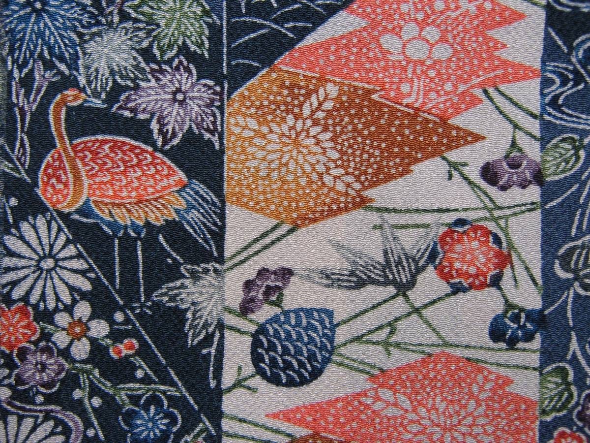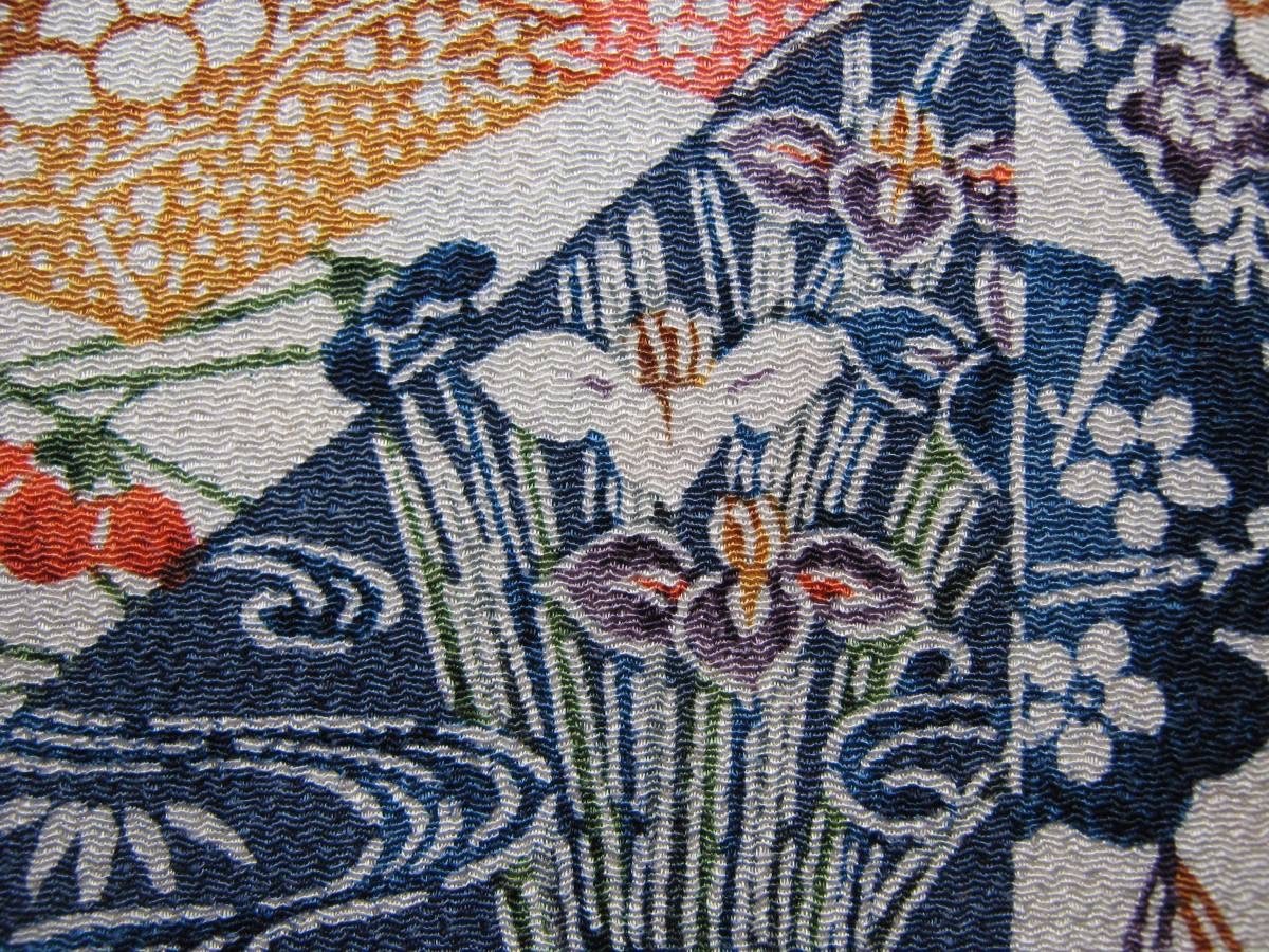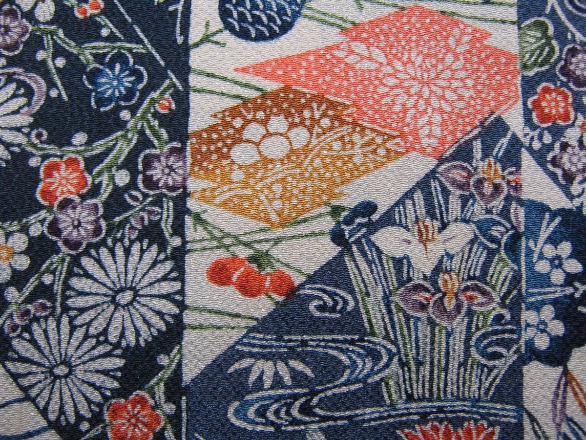 古布 半衿【正絹しぼ縮緬/列取 古典柄 四季花 鶴 松ぼっくり 菊楓菖蒲桜梅笠松笹遠山茶屋辻松皮菱青海波流水 多色 藍×白鼠地】はぎれ