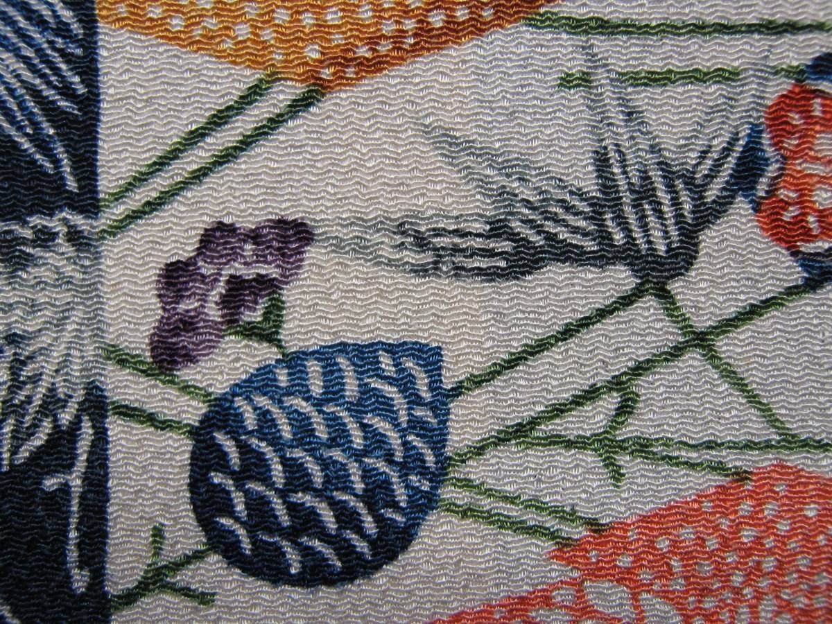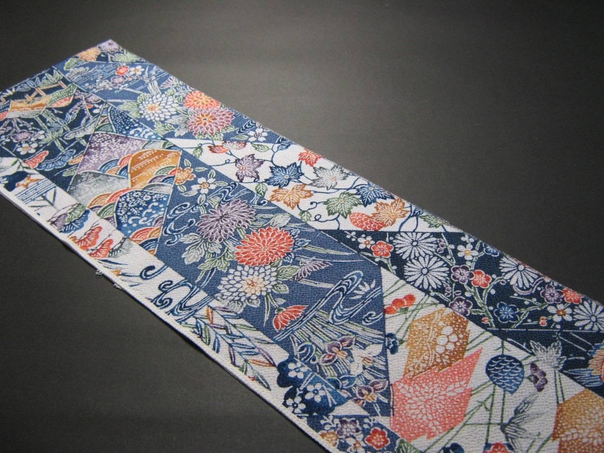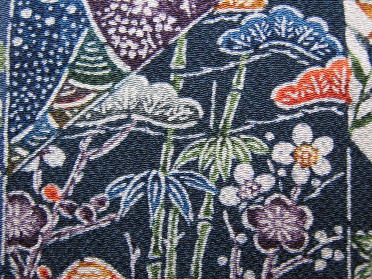 古布 半衿【正絹しぼ縮緬/列取 古典柄 四季花 鶴 松ぼっくり 菊楓菖蒲桜梅笠松笹遠山茶屋辻松皮菱青海波流水 多色 藍×白鼠地】はぎれ