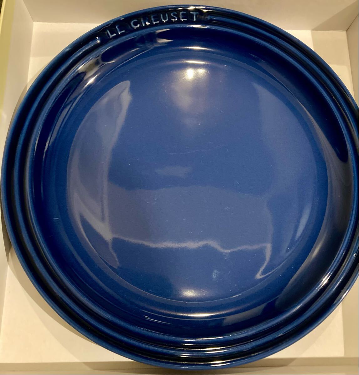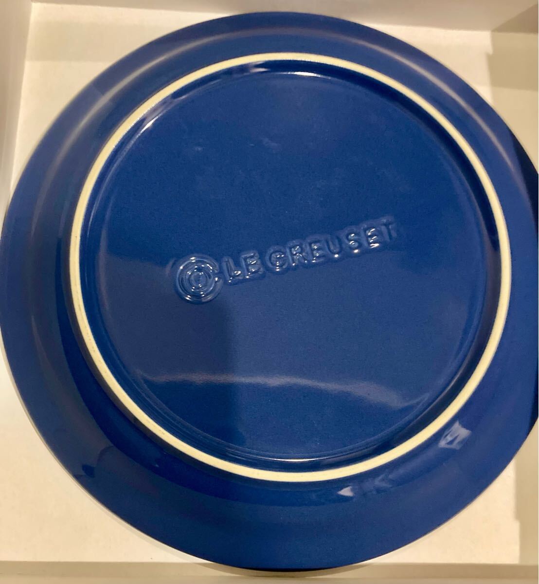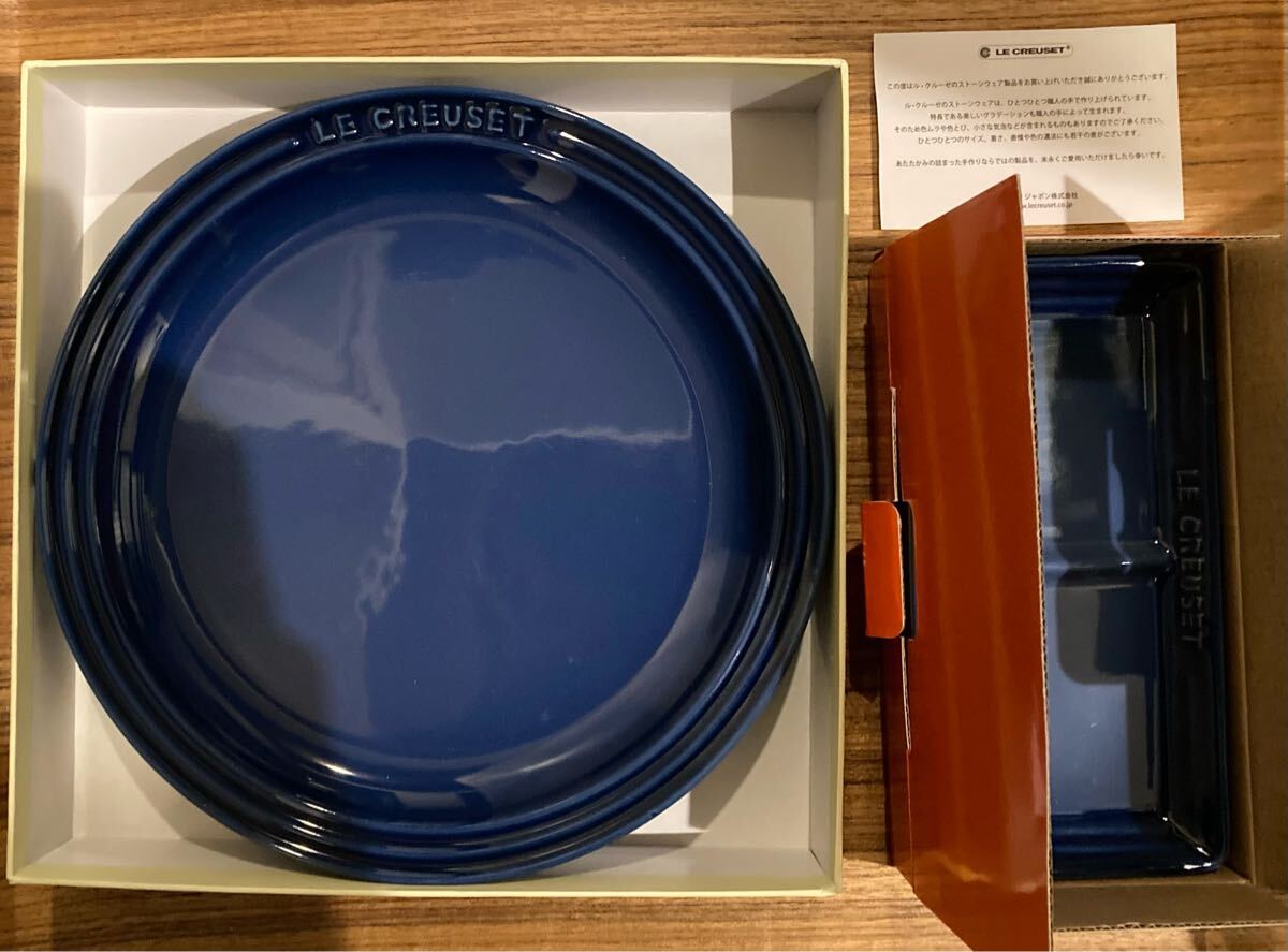 廃盤色レア★LE CREUSETルクルーゼ★ラウンド・プレート 23cm2枚&ヤクミプレート17cm 計3点 ロイヤルブルー ロゴ入り 国内正規品 箱入り