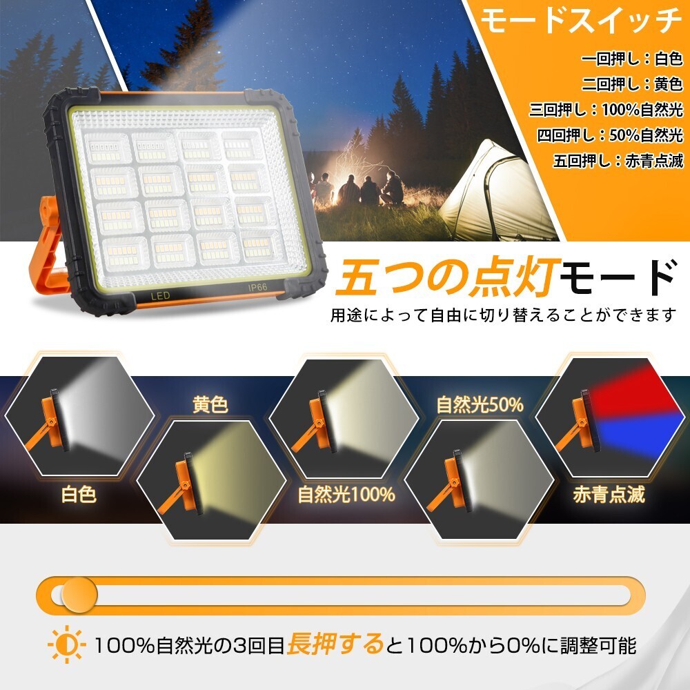 【五つ点灯モード】高輝度192個高品質SMDチップが搭載しています。点灯モード:昼白色、黄色、100%自然光、50%自然光、赤青点滅モードが整備されています。100W相当で、特別設計されたブラケットは180度回転できて、取っ手や吊り掛けとしても使えます。注)ライトは曝光の効果がありますから、点灯中の光源を近くで直視しないでください。