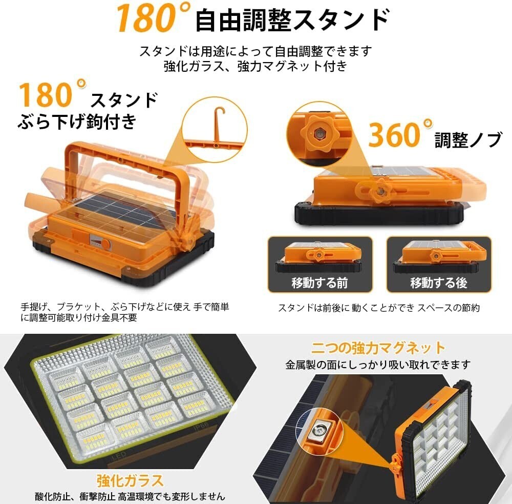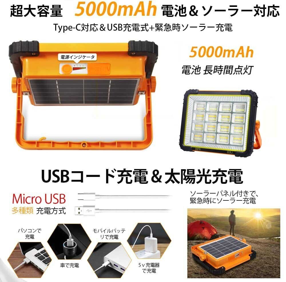 【大容量電池&二種類充電】led投光器は大容量電池内蔵し、長い時間点灯可能。USBポートも付きて、作業などの必需品ともいえます。ライトは大容量電池が内蔵し、ソーラーパネルも搭載で、緊急時ソーラー充電も可能なので、電気工事の時に、或は地震、台風などの災害の緊急時に停電してもライトは照明の機能が維持できます。