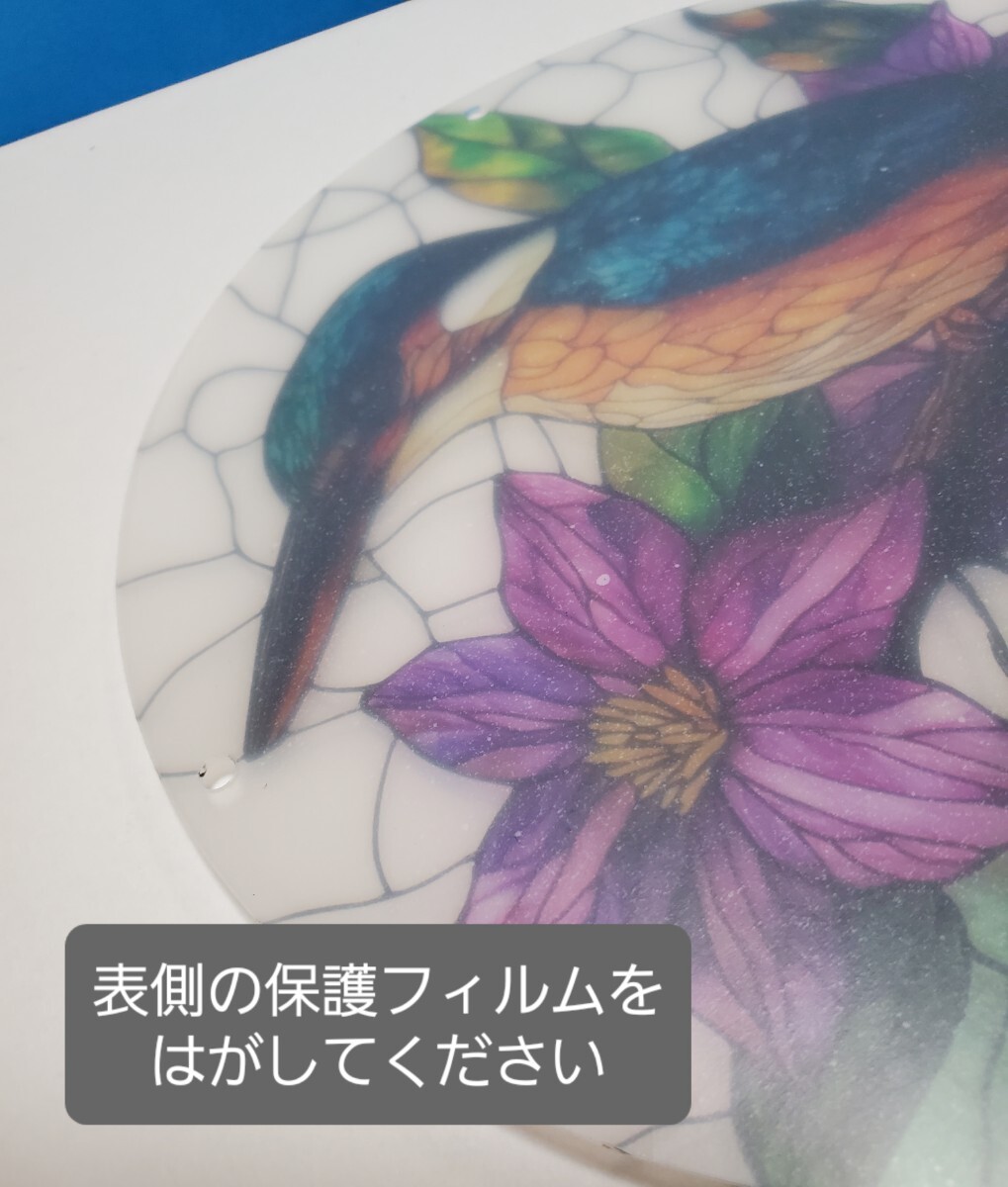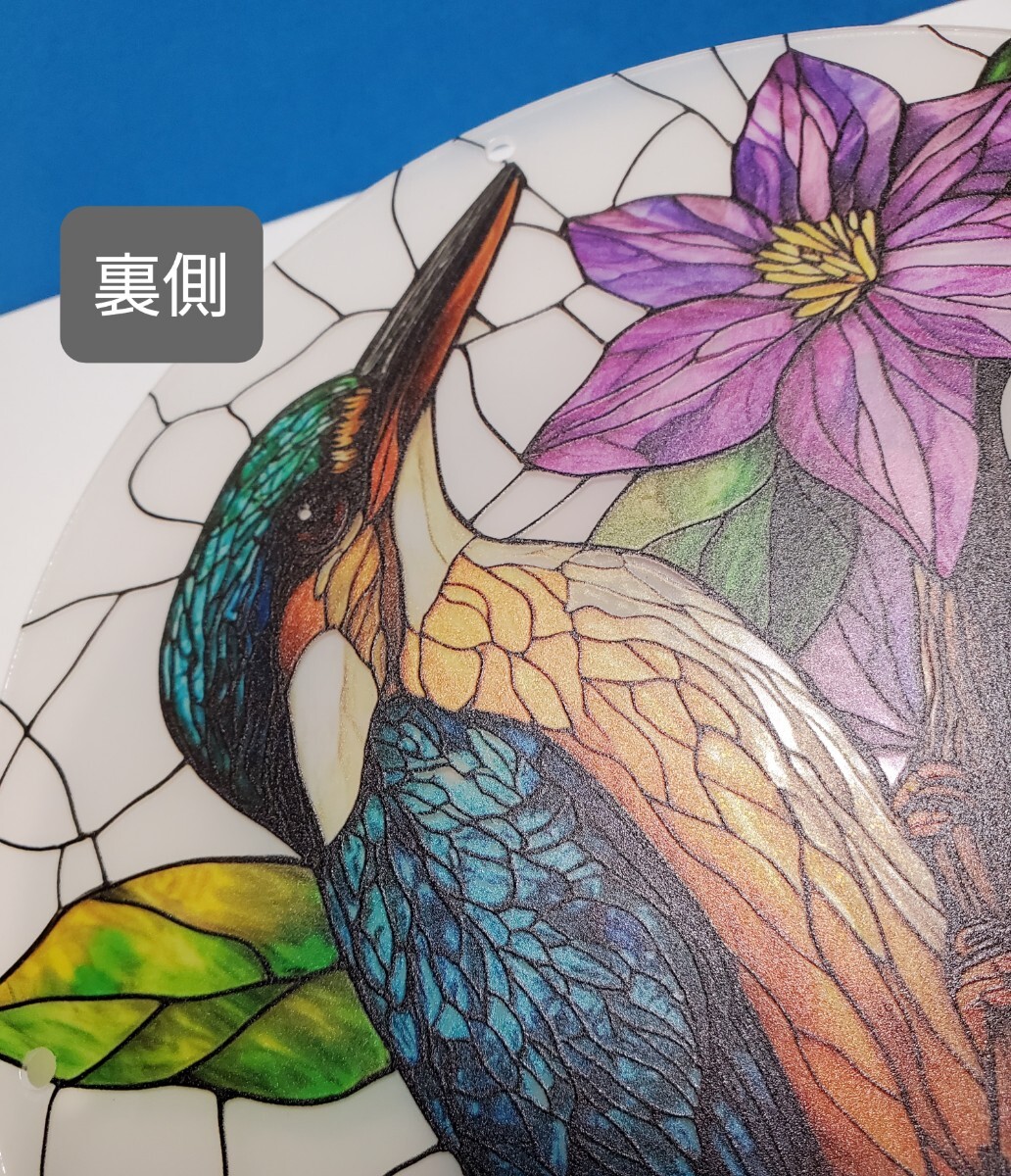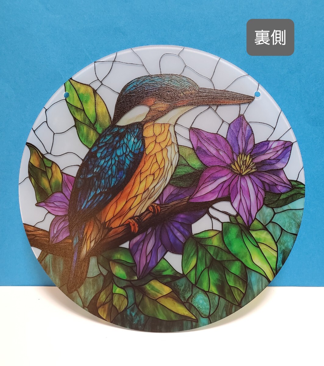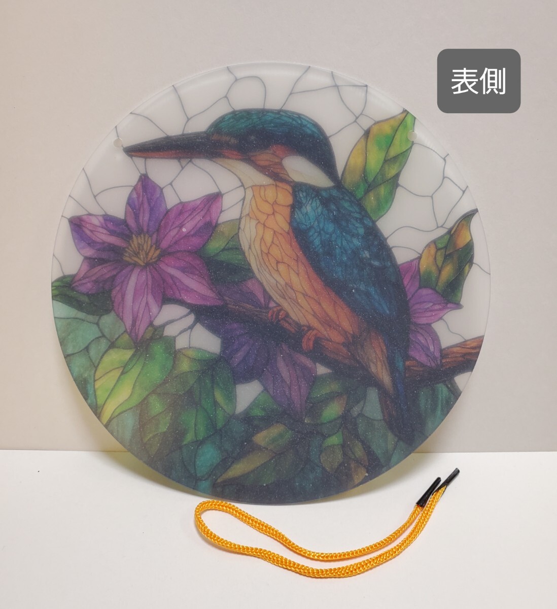 カワセミとクレマチスをモチーフにした半透明の飾りです。上の方に穴が2つ開いています。