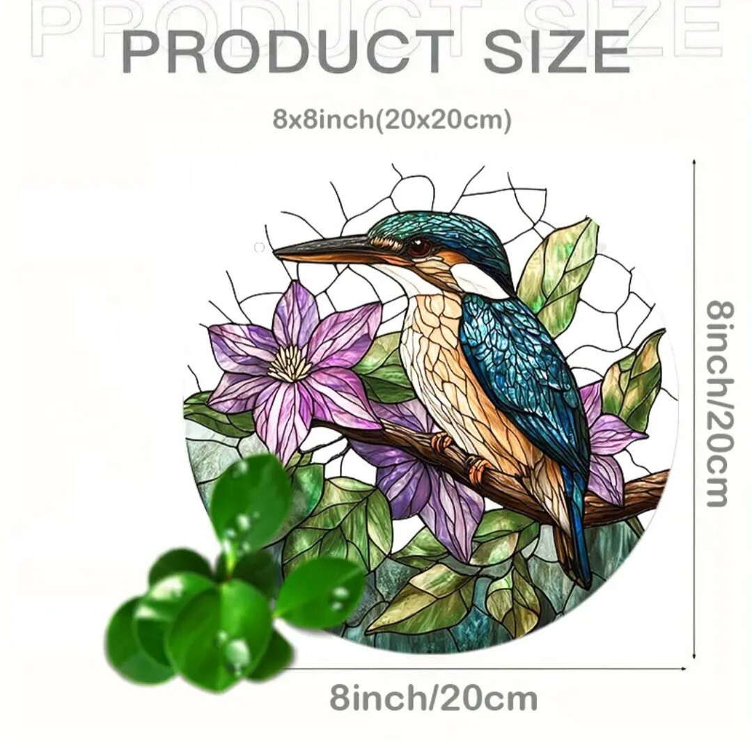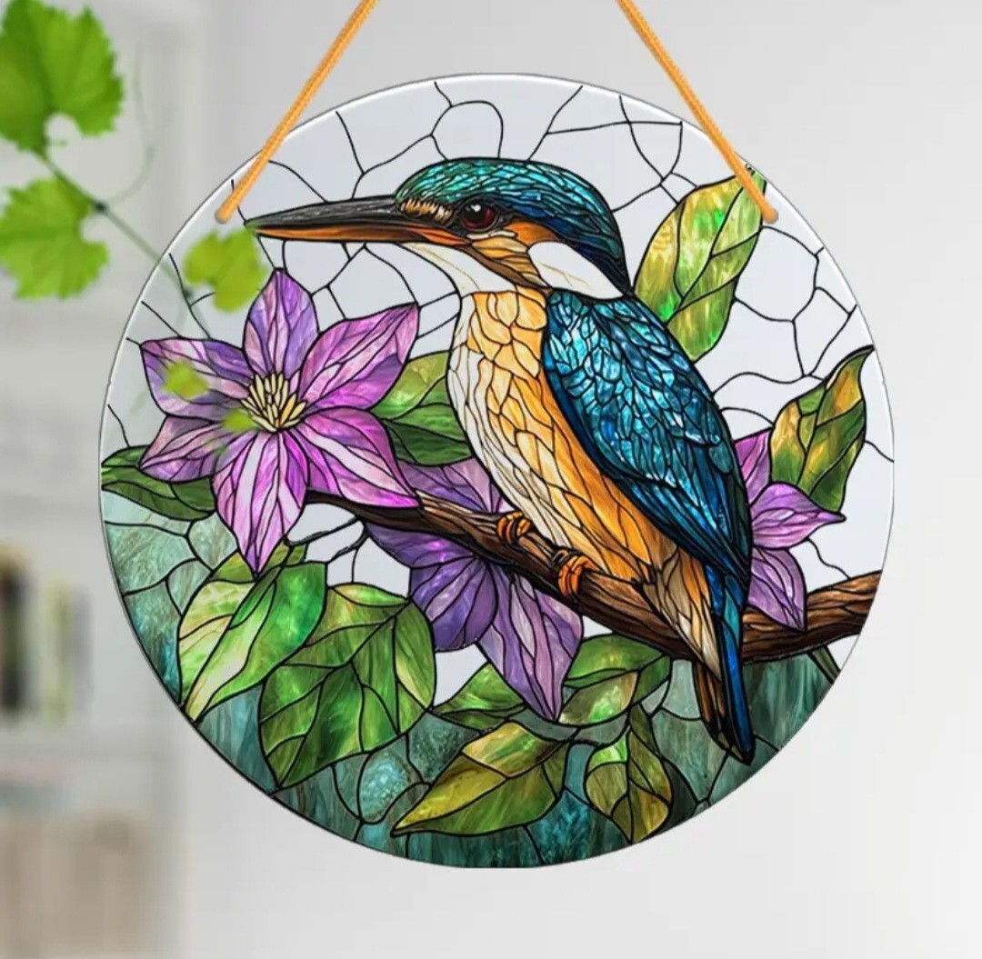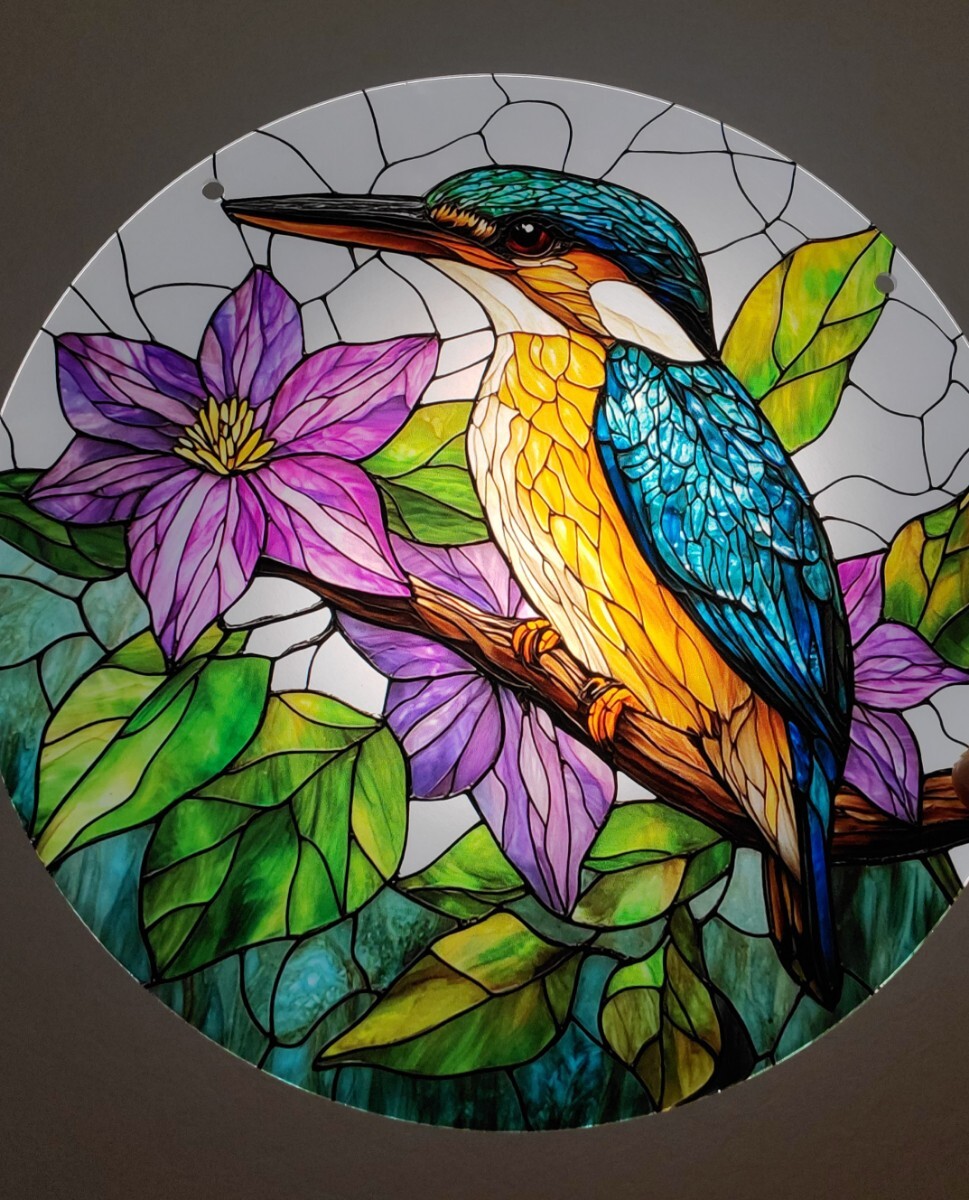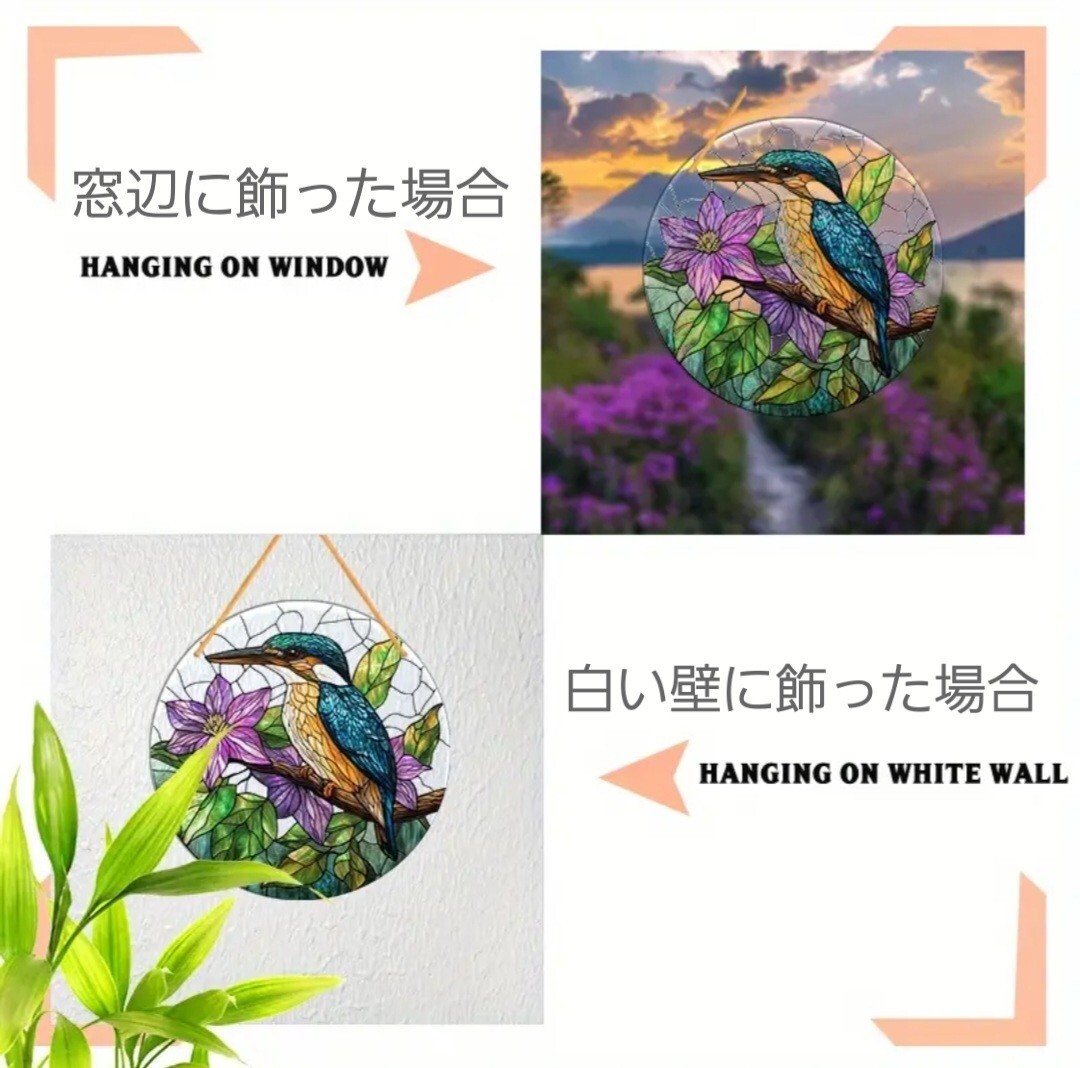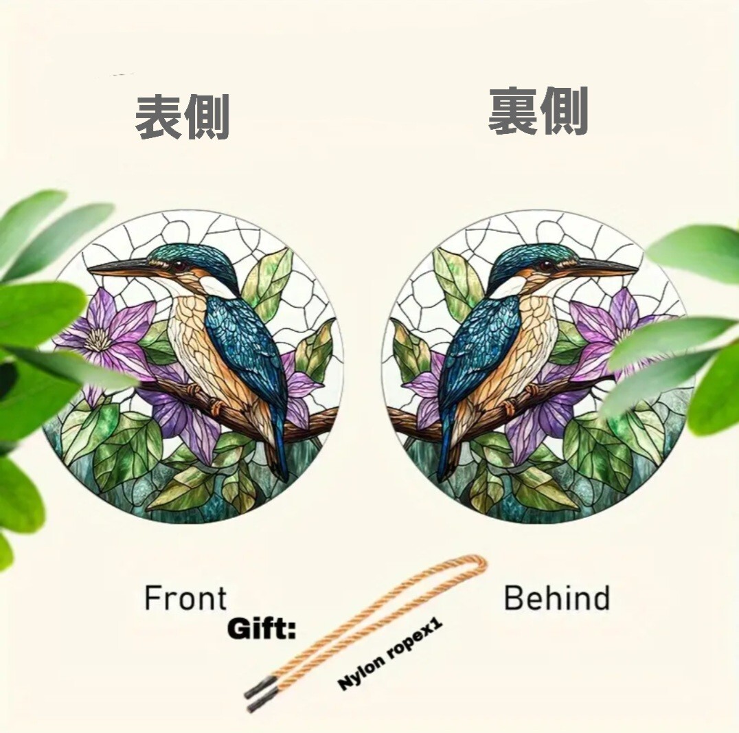 カワセミとクレマチスをモチーフにした半透明の飾りです。上の方に穴が2つ開いています。