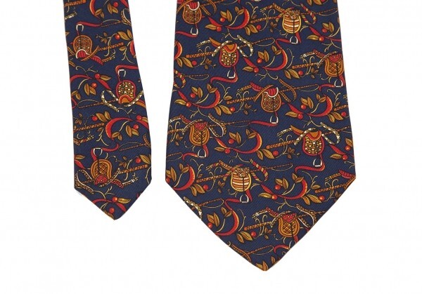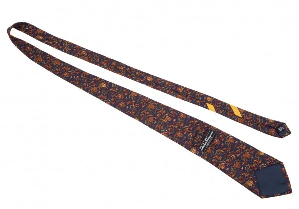 サルバトーレフェラガモSalvatore Ferragamo 木の実総柄シルクネクタイ 紺オレンジ赤 |