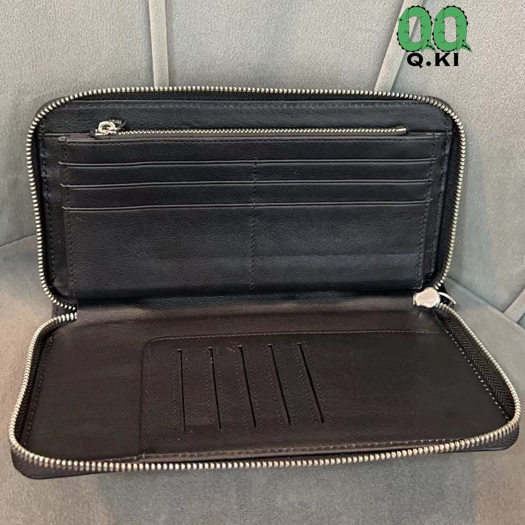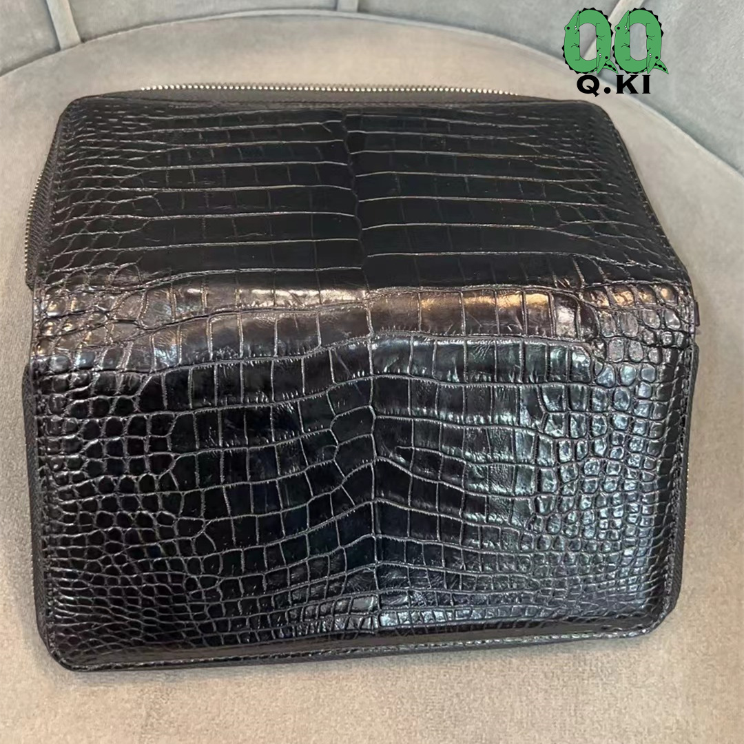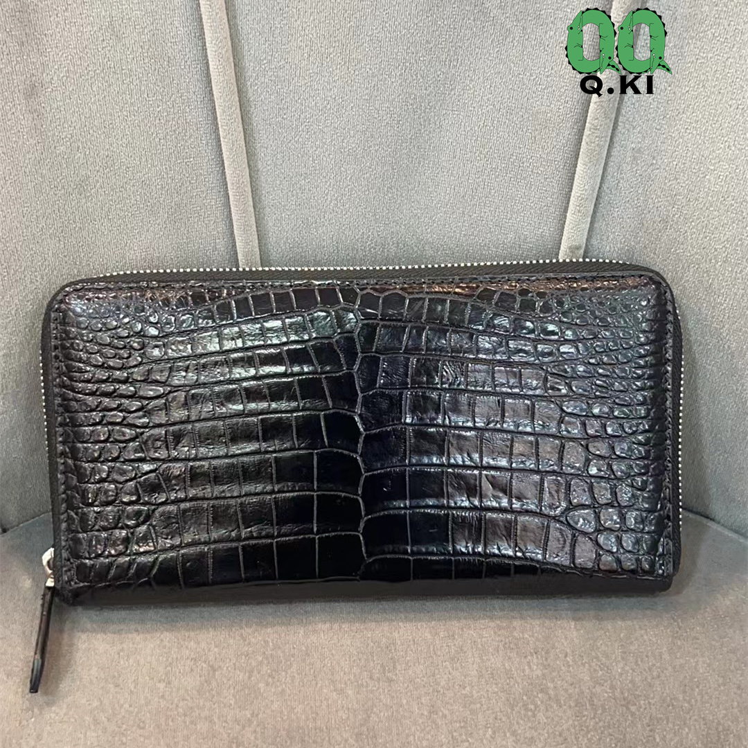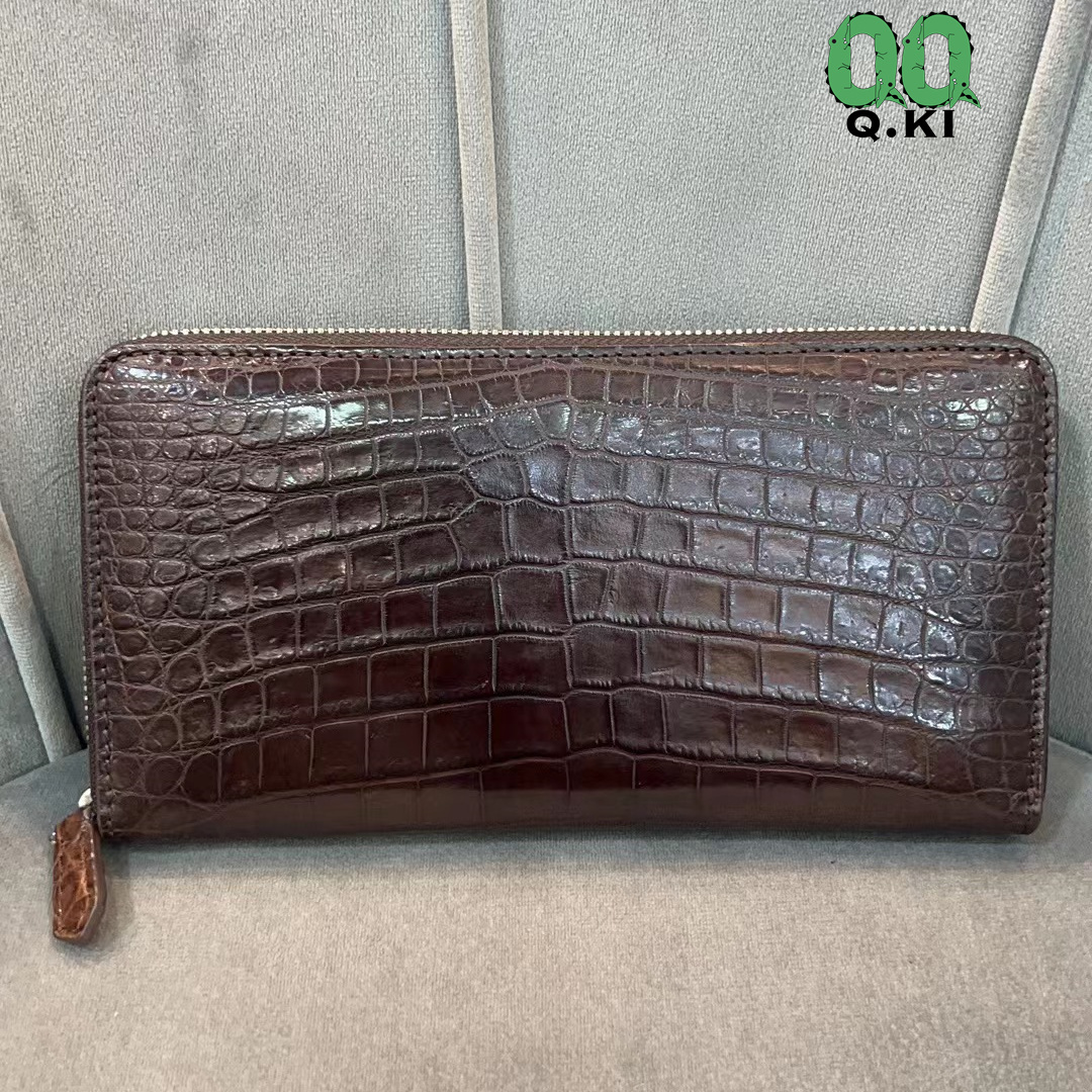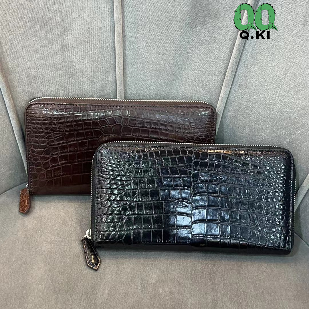 クロコダイルレザー本物 センター取り ラウンドファスナー 長財布 名刺ケース 小銭入れ 一枚革腹革 ワニ革保証 ウォレット 黒/茶 大容量