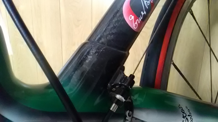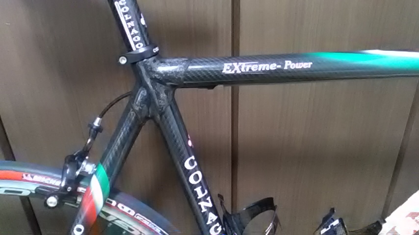 *その他:組み付けは機械式ですが電動変速機用穴(5mm程度)が2か所空けてあります。⇒専門店にて加工走行問無                        ⇒シールにて隠してあります。写真4,5(ダウンチューブ左上部⇒カーボン柄シール、チェーンステー右後方⇒コルナゴマークにて)