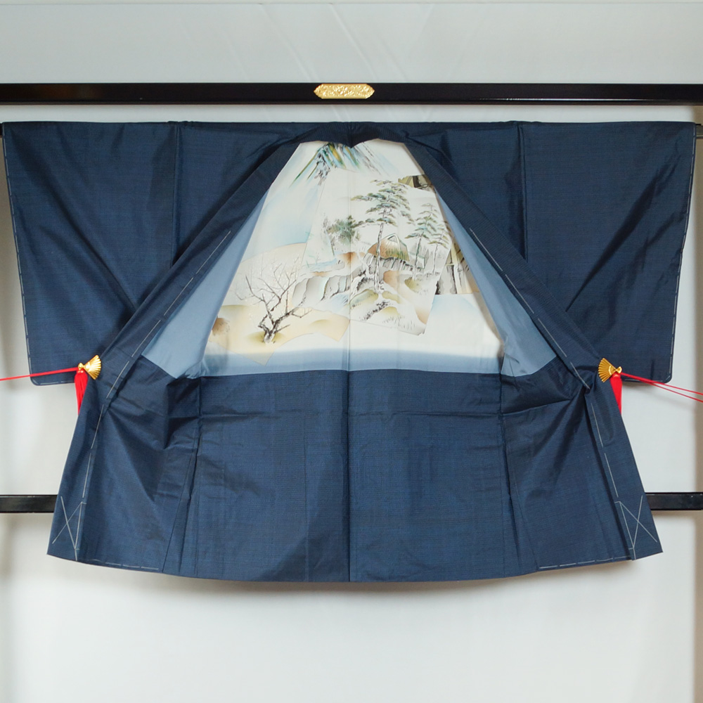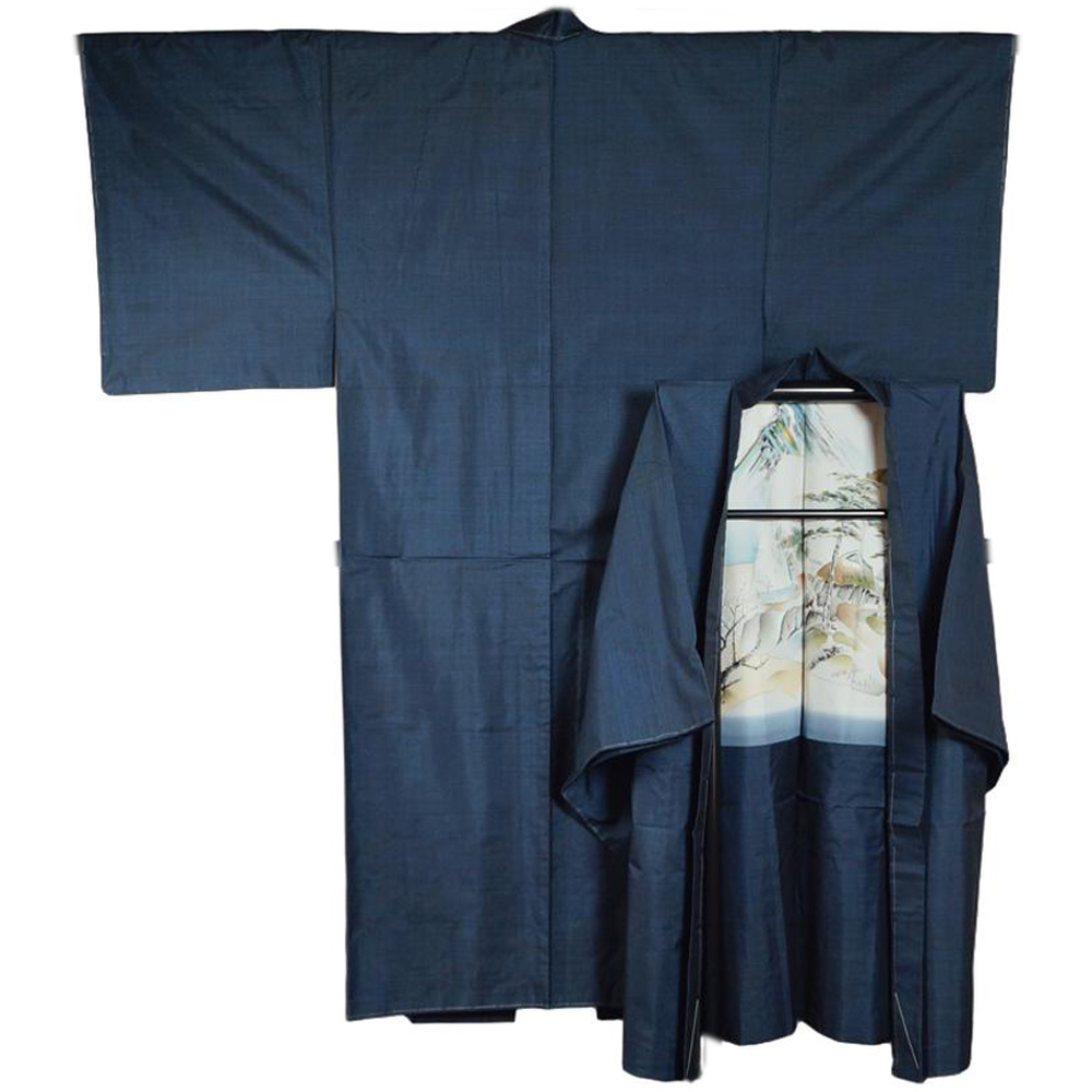| 商品 説明 | 肌当たりのなめらかな平織の濃藍色系の地に総亀甲模様が織られた大島紬の着物と羽織のアンサンブルです。羽裏は富士山に地紙・色紙、農村模様です。羽織紐・証紙は付いておりません。 |